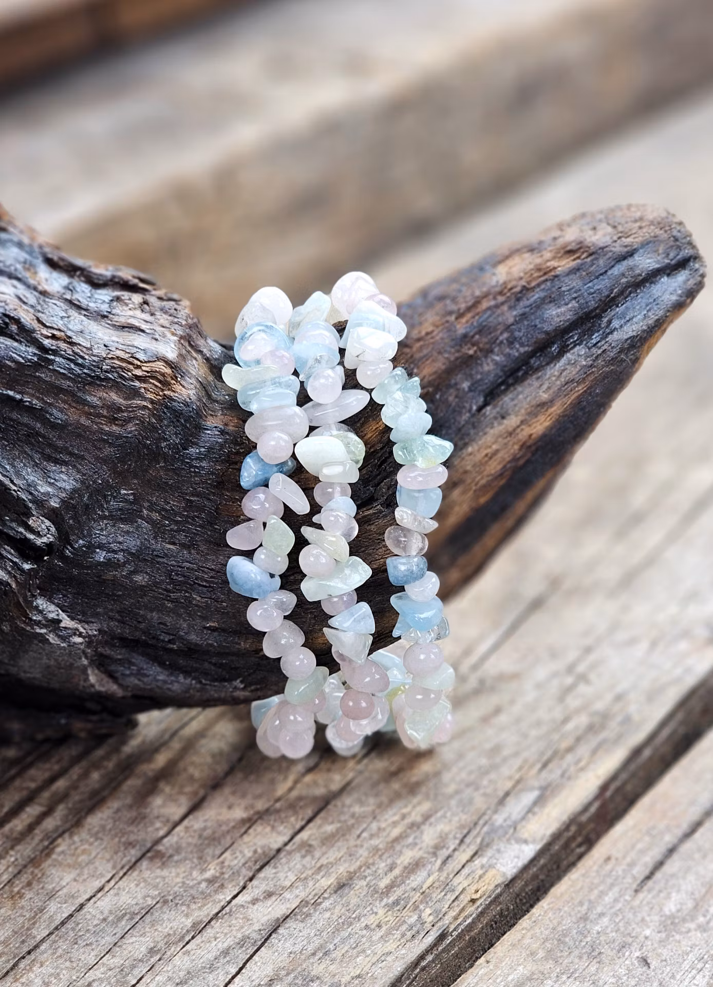 Mycket vackert elastiskt armband i Morganit (Beryll) med underbar färgmix. Väldigt nätt & stilren modell som är mycket fin att ha bara en runt handleden eller flera tillsammans. Säljes styckvis. Du köper slumpvis liknande smycke enligt text & bild ovan. Tänk på att kristaller kommer från naturen & naturliga sprickor & ojämnhet kan förekomma. Färger kan skilja sig beroende på hur ljuset faller ner på kristallen samt även mellan olika bildskärmar m.m.