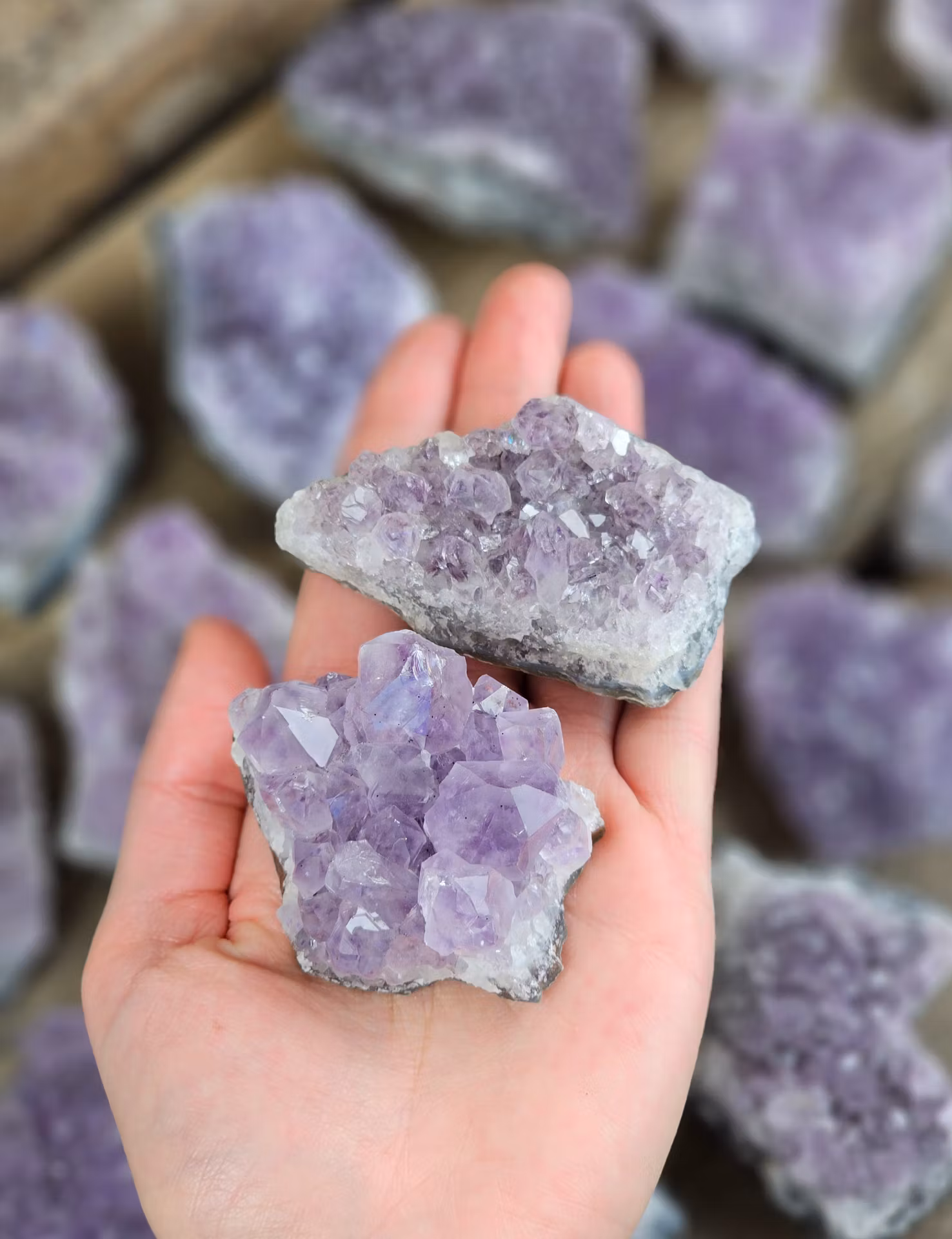 Mycket vackra stora Ametistkluster. Säljes styckvis. De skiftar i utseende. Du köper slumpvis liknande kristall enligt text & bild ovan. Tänk på att kristaller kommer från naturen & naturliga sprickor & ojämnheter kan förekomma. Färger kan skilja sig beroende på hur ljuset faller ner på kristallen samt även mellan olika bildskärmar m.m.