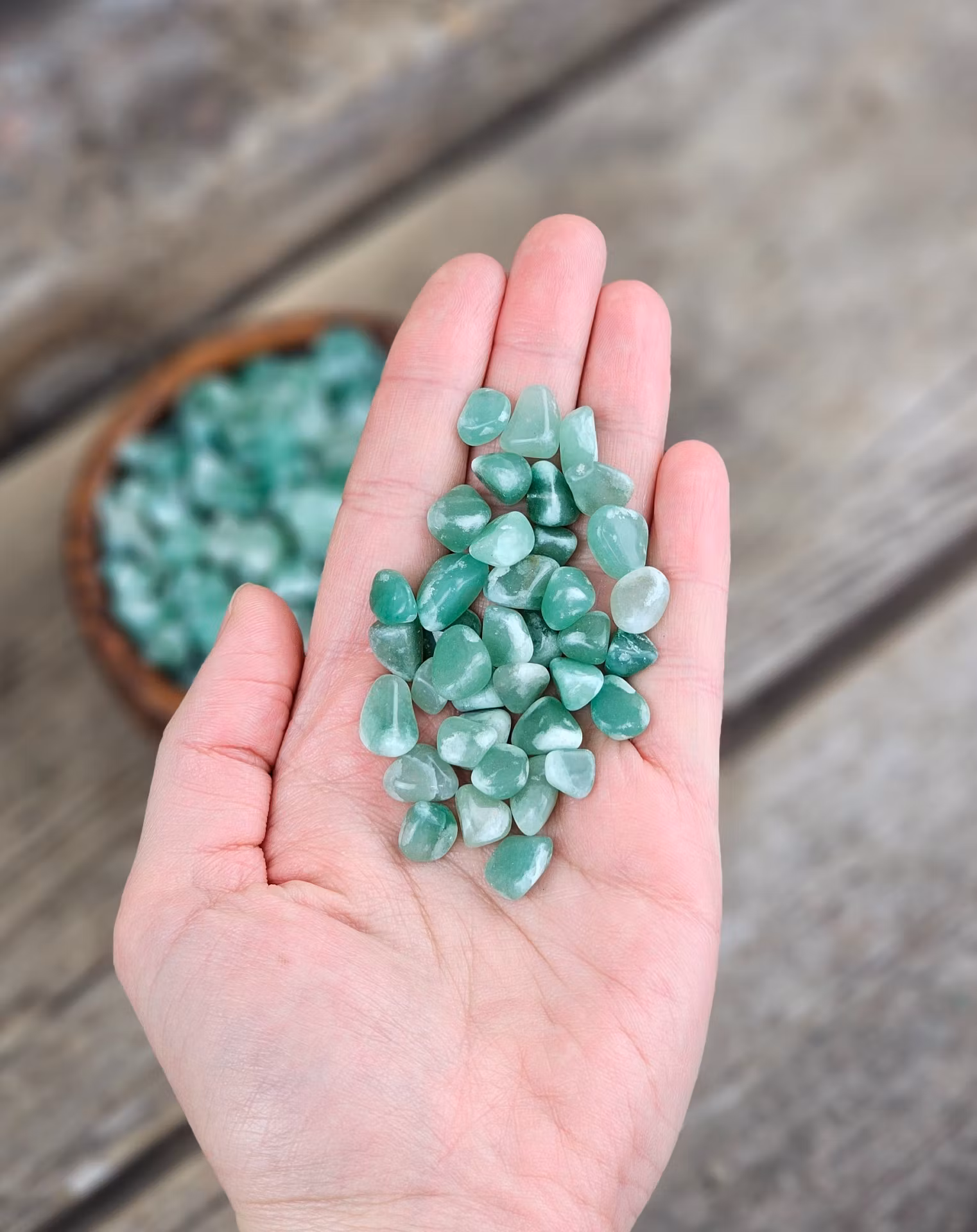 Mycket fina små trumlade stenar av Grön Aventurin. Säljes per 30 gram, vilket är mängden som visas på bilden med påse i handen. De skiftar i utseende & form. Du köper slumpvis liknande kristaller enligt text & bild ovan. Tänk på att kristaller kommer från naturen & naturliga sprickor & ojämnheter kan förekomma. Färger kan skilja sig beroende på hur ljuset faller ner på kristallen samt även mellan olika bildskärmar m.m.