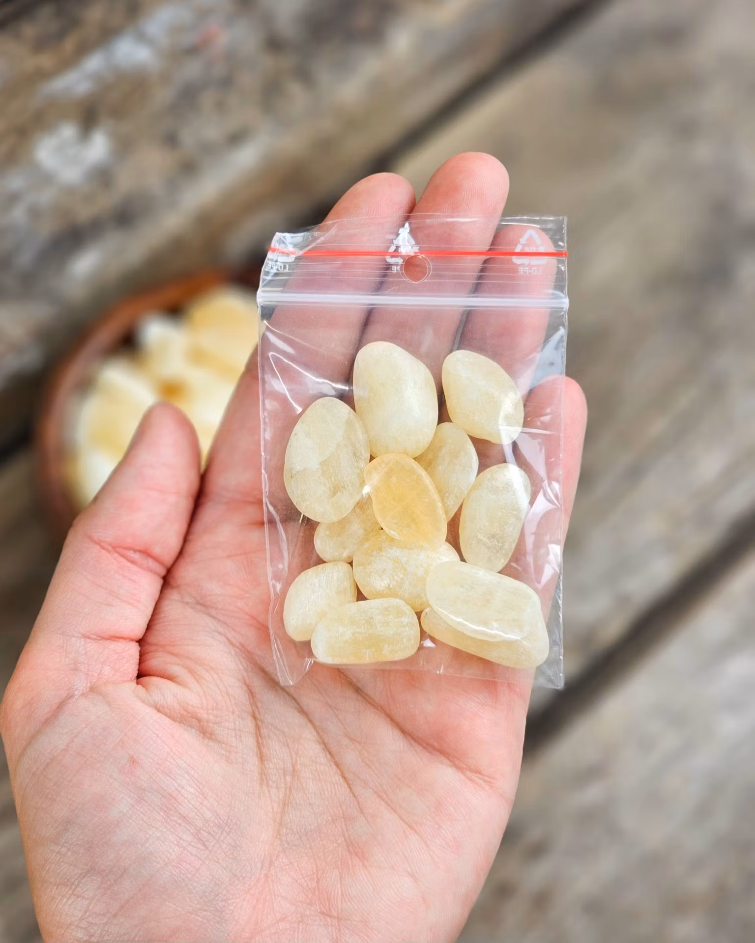 Mycket fina små trumlade stenar av Gul Kalcit. Säljes per 30 gram, vilket är mängden som visas på bilden med påse i handen. De skiftar i utseende & form. Du köper slumpvis liknande kristaller enligt text & bild ovan. Tänk på att kristaller kommer från naturen & naturliga sprickor & ojämnheter kan förekomma. Färger kan skilja sig beroende på hur ljuset faller ner på kristallen samt även mellan olika bildskärmar m.m.