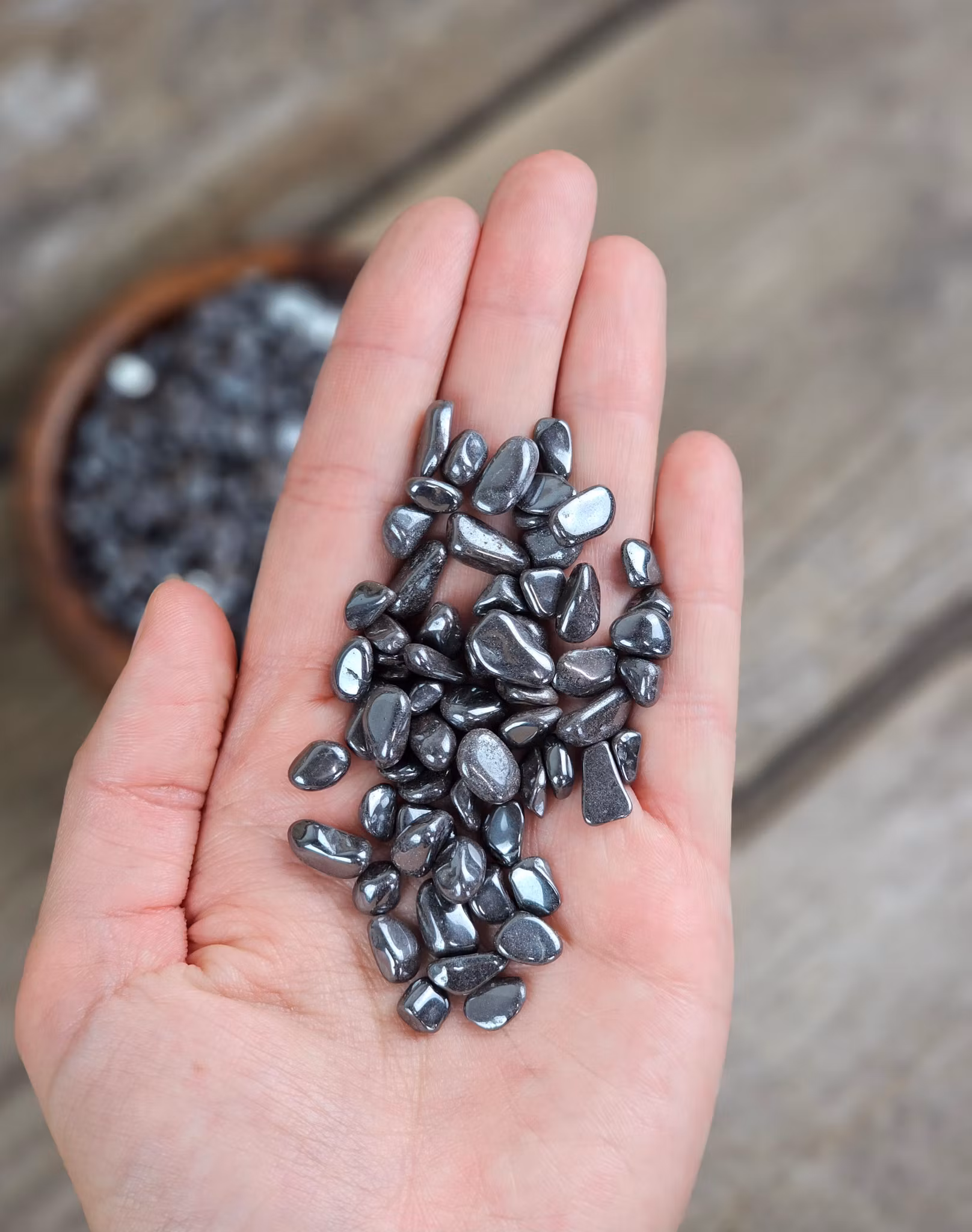 Mycket fina små trumlade stenar av Hematit. Säljes per 50 gram, vilket är mängden som visas på bilden med påse i handen. De skiftar i utseende & form. Du köper slumpvis liknande kristaller enligt text & bild ovan. Tänk på att kristaller kommer från naturen & naturliga sprickor & ojämnheter kan förekomma. Färger kan skilja sig beroende på hur ljuset faller ner på kristallen samt även mellan olika bildskärmar m.m.