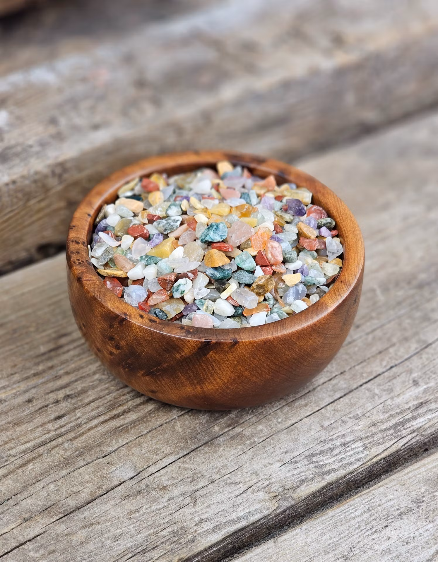 Mycket fina små trumlade mini-stenar, så kallade kristallchips, av en stor mix med bland annat Rosenkvarts, Ametist, Karneol, Bergkristall, Grön Aventurin, diverse Agat, Mossagat, Trädagat, Röd Aventurin, Röd jaspis, Gul Jaspis m.m.. Säljes per 50 gram, vilket är mängden som visas på bilden med påse i handen. De skiftar i utseende & form. Du köper slumpvis liknande kristaller enligt text & bild ovan. Tänk på att kristaller kommer från naturen & naturliga sprickor & ojämnheter kan förekomma. Färger kan skilja sig beroende på hur ljuset faller ner på kristallen samt även mellan olika bildskärmar m.m.