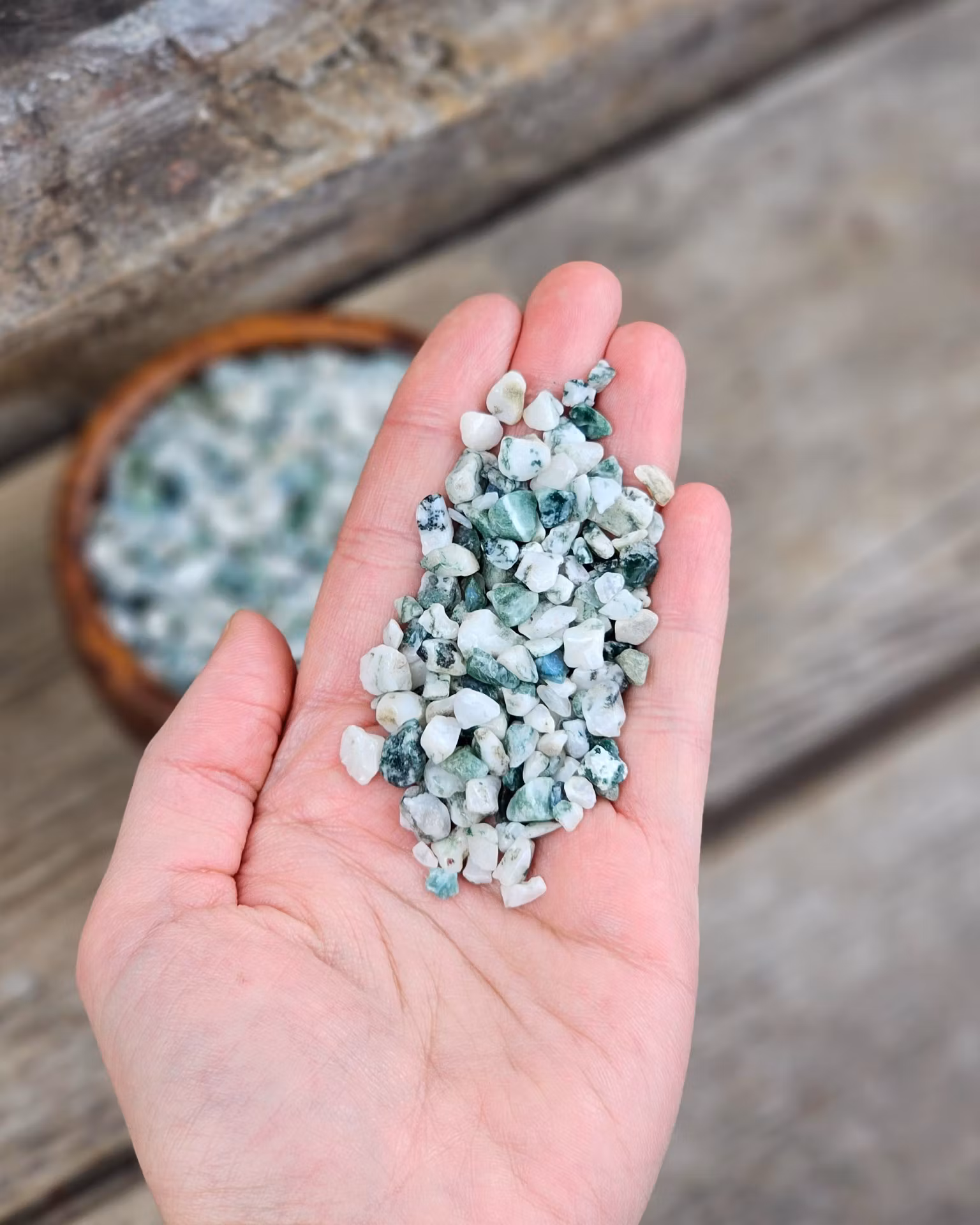 Mycket fina små trumlade mini-stenar, så kallade kristallchips, av Trädagat. Säljes per 50 gram, vilket är mängden som visas på bilden med påse i handen. De skiftar i utseende & form. Du köper slumpvis liknande kristaller enligt text & bild ovan. Tänk på att kristaller kommer från naturen & naturliga sprickor & ojämnheter kan förekomma. Färger kan skilja sig beroende på hur ljuset faller ner på kristallen samt även mellan olika bildskärmar m.m.