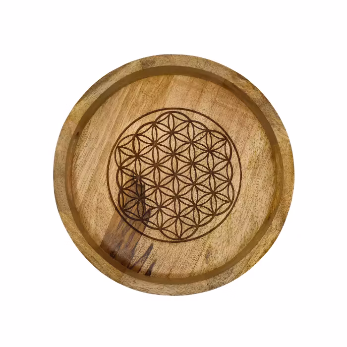 Mycket vacker lyxig bricka med symbolen Flower Of Life, tillverkad i mangoträ. Flower Of Life är även kallad Livets blomma. Livets blomma är ett geometriskt mönster som består av 19 korsande cirklar. Varje cirkel är jämnt fördelad för att avslöja ett slående mönster av överlappande jämna blommor. Det är tänkt att representera alla livscykler, från födsel till död till återfödelse. Perfekt till dina kristaller, smycken och andra vackra ting. Säljes styckvis, kristaller/smycken/oljor ingår ej. Du köper en bricka enligt text & bild ovan. Små skillnader kan förekomma i produktens utseende på grund av dess naturmaterial. Färger kan skilja sig beroende på hur ljuset faller ner på produkten samt även mellan olika bildskärmar m.m.