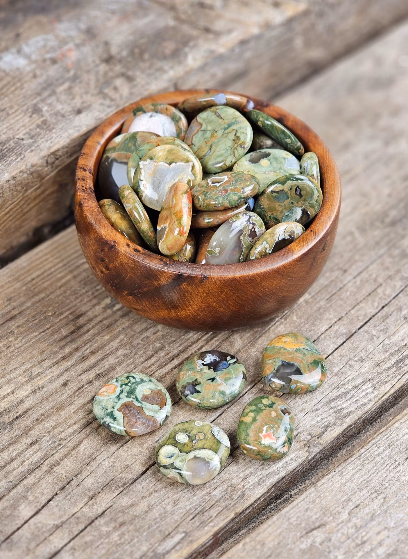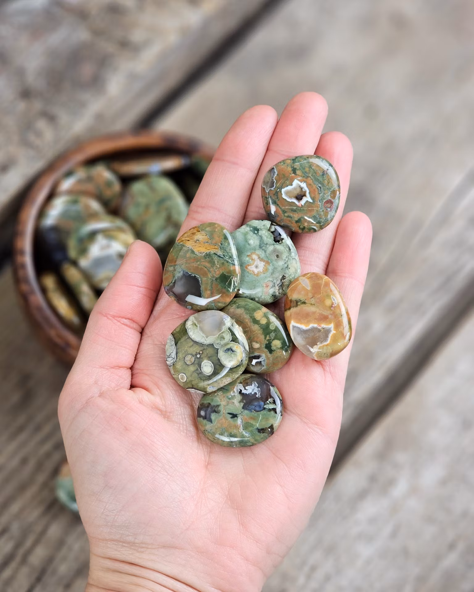 Mycket vackra små polerade plattor i Ryolit. Så härliga mönster och färger! Detta är en så kallade handsten eller touchstone med runda former. Mycket hög kvalité. Säljes styckvis. De skiftar i utseende. Du köper en slumpvis liknande kristall enligt text & bild ovan. Tänk på att kristaller kommer från naturen & naturliga sprickor samt ojämnhet kan förekomma. Färger kan skilja sig beroende på hur ljuset faller ner på kristallen samt även mellan olika bildskärmar m.m.