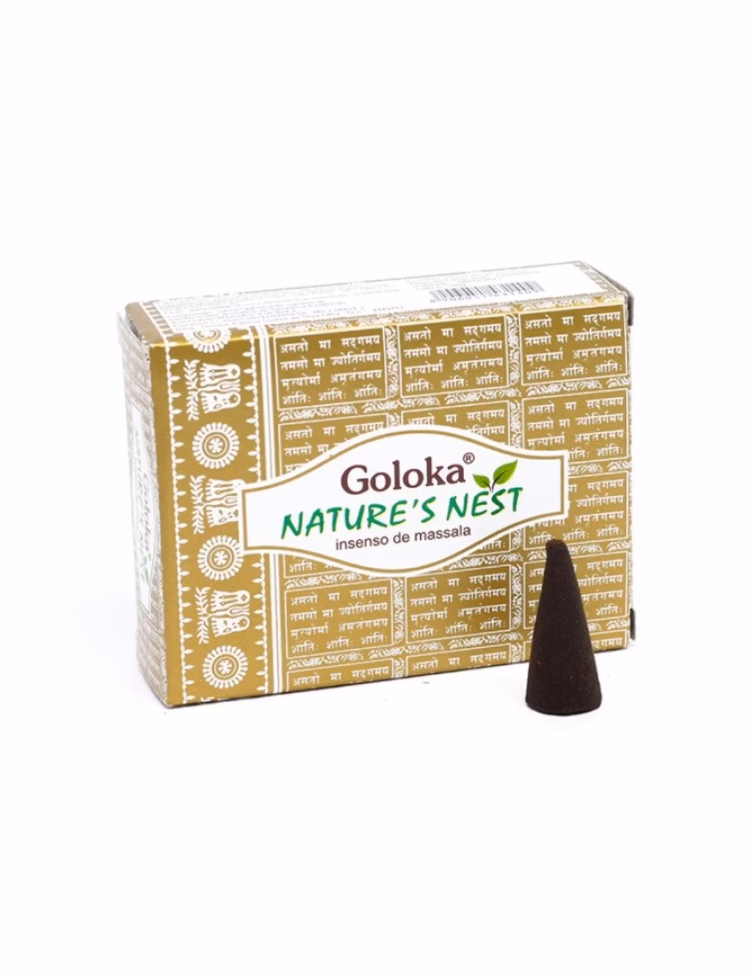 Doft: Nature's Nest. Fräsch och söt med milda inslag av trä. Denna rökelse lugnar och tillför ny energi. Skapar en skön atmosfär för avkoppling. Denna fina rökelse ingåri Goloka's Nature-serie.