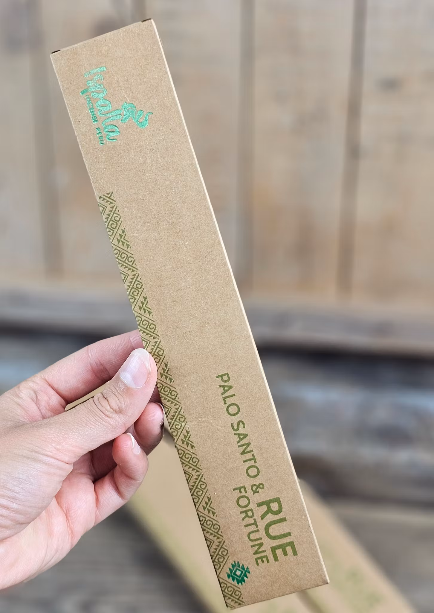 Doft: Palo Santo & Rue. Rue (Vinruta), särskilt i kombination med Palo Santo, skyddar din energi och lockar till sig lycka, speciellt när det gäller arbete och i kärlek. Den motar bort dåliga energier och skyddar dig och din inre kraft. Vinruta är en mytomspunnen medicinört som kallas Herb of Grace. Ingredienser: Bambustav, Palo santo-pulver, Palo Santo-harts, pulver gjort av vinrutsblad, destillerat vatten. Miljövänlig produkt. Handgjorda i Peru. Inget barnarbete. Inga animaliska biprodukter.