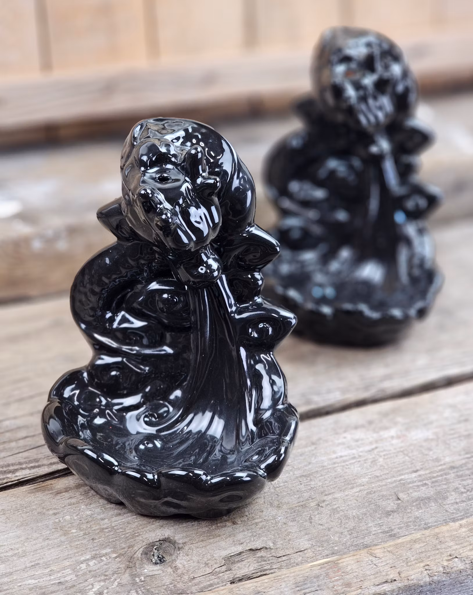 Mycket fin rökelsebrännare i keramik. Dessa stora Drakar är speciellt anpassade för att bränna backflow-koner, men går även att bränna vanliga koner på. När du tänder din rökelsekon av modellen backflow och sätter på toppen av denna fina rökelsehållare så sprider sig röken nedåt likt ett svepande vattenfall, vilket ger en vacker lugnande effekt. Säljes styckvis. Rökelser ingår ej, dessa köpes separat. Du köper slumpvis liknande rökelsehållare enligt text & bild ovan. Tänk på att små skillnader kan förekomma. Färger kan skilja sig beroende på hur ljuset faller ner på produkten samt även mellan olika bildskärmar m.m.