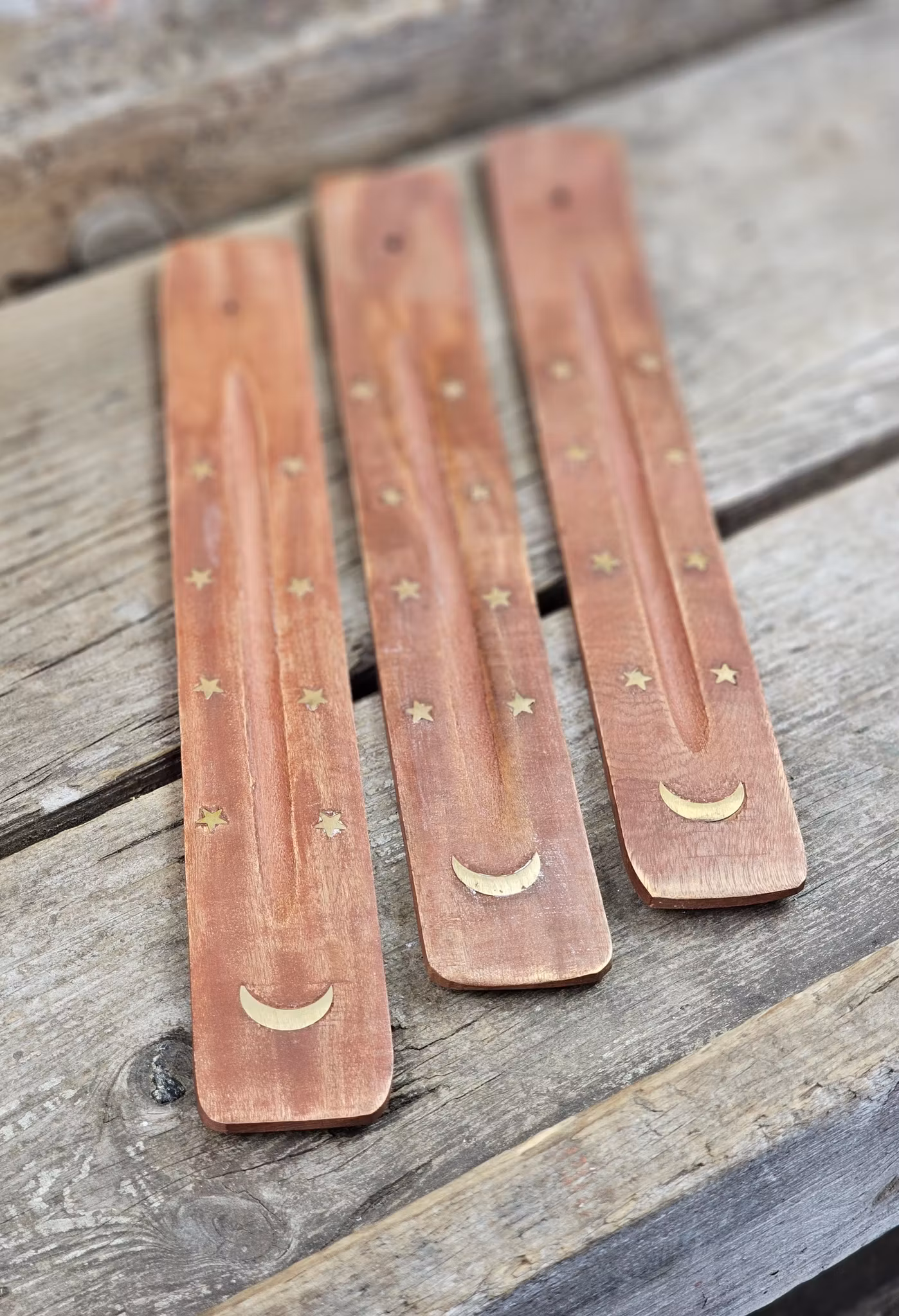 Fina rökelsehållare i trä med små stjärnor på sidorna och en stor måne nedtill i guldfärg. Dessa har ett borrat hål som hållare för rökelsepinnar samt målade detaljer i guld. Säljes styckvis. Rökelser ingår ej, dessa köpes separat. De skiftar i utseende. Du köper slumpvis liknande rökelsehållare enligt text & bild ovan. Ojämnheter i form och färg kan förekomma. Färger kan skilja sig beroende på hur ljuset faller ner på produkten samt även mellan olika bildskärmar m.m.