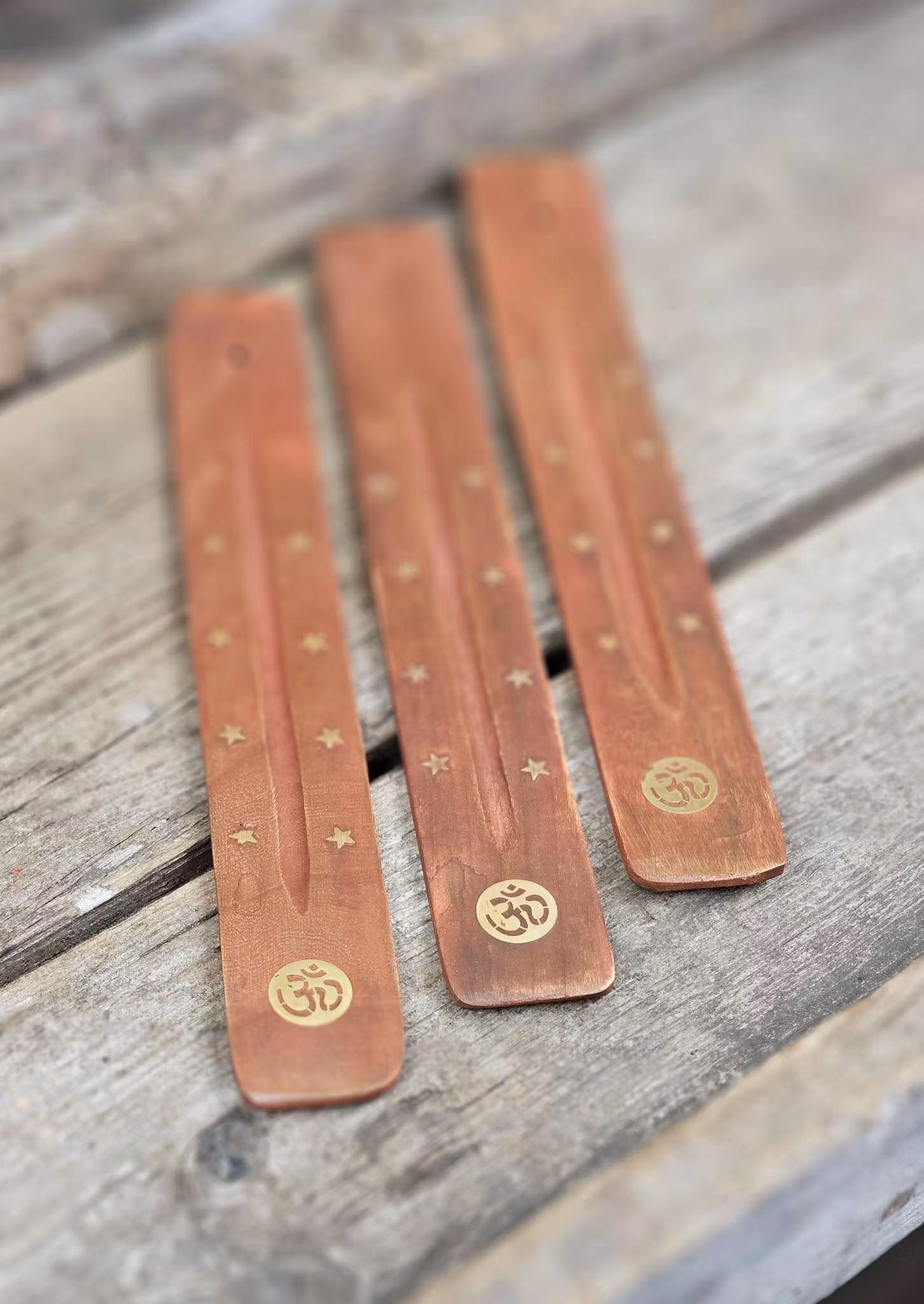 Fina rökelsehållare i trä med små stjärnor på sidorna och stort Ohm-tecken nedtill i guldfärg. Ohm-tecknet symboliserar evigheten, oändligheten och universum. Dessa har ett borrat hål som hållare för rökelsepinnar samt målade detaljer i guld. Säljes styckvis. Rökelser ingår ej, dessa köpes separat. De skiftar i utseende. Du köper slumpvis liknande rökelsehållare enligt text & bild ovan. Ojämnheter i form och färg kan förekomma. Färger kan skilja sig beroende på hur ljuset faller ner på produkten samt även mellan olika bildskärmar m.m.