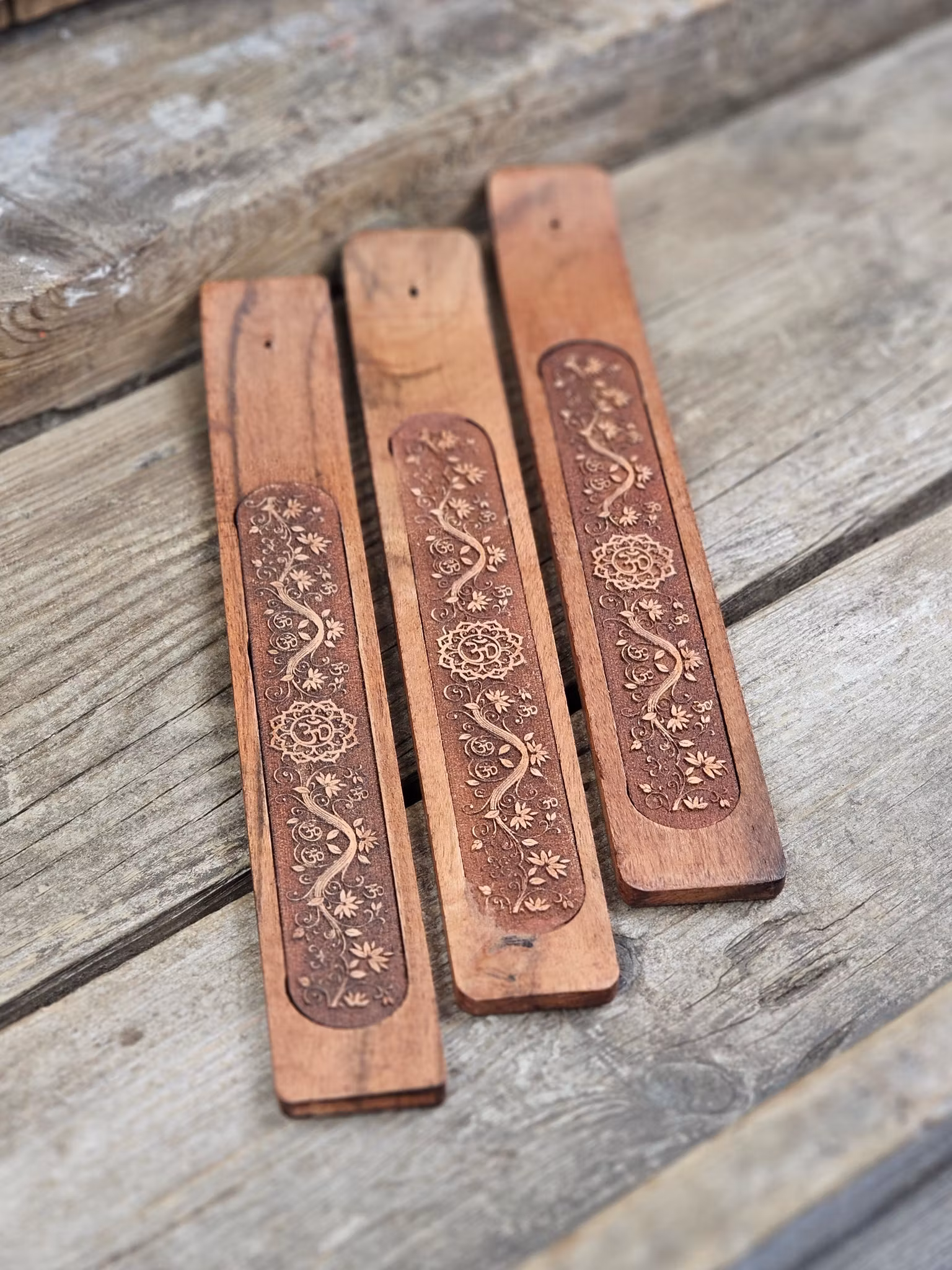 Mycket vackra rökelsehållare i trä med Ohm-tecken. Ohm-tecknet symboliserar evigheten, oändligheten och universum. Dessa har ett borrat hål som hållare för rökelsepinnar. Väldigt rejäl och fin kvalité. Säljes styckvis. Rökelser ingår ej, dessa köpes separat. De skiftar i utseende. Du köper slumpvis liknande rökelsehållare enligt text & bild ovan. Ojämnhet i form och färg kan förekomma. Färger kan skilja sig beroende på hur ljuset faller ner på produkten samt även mellan olika bildskärmar m.m.