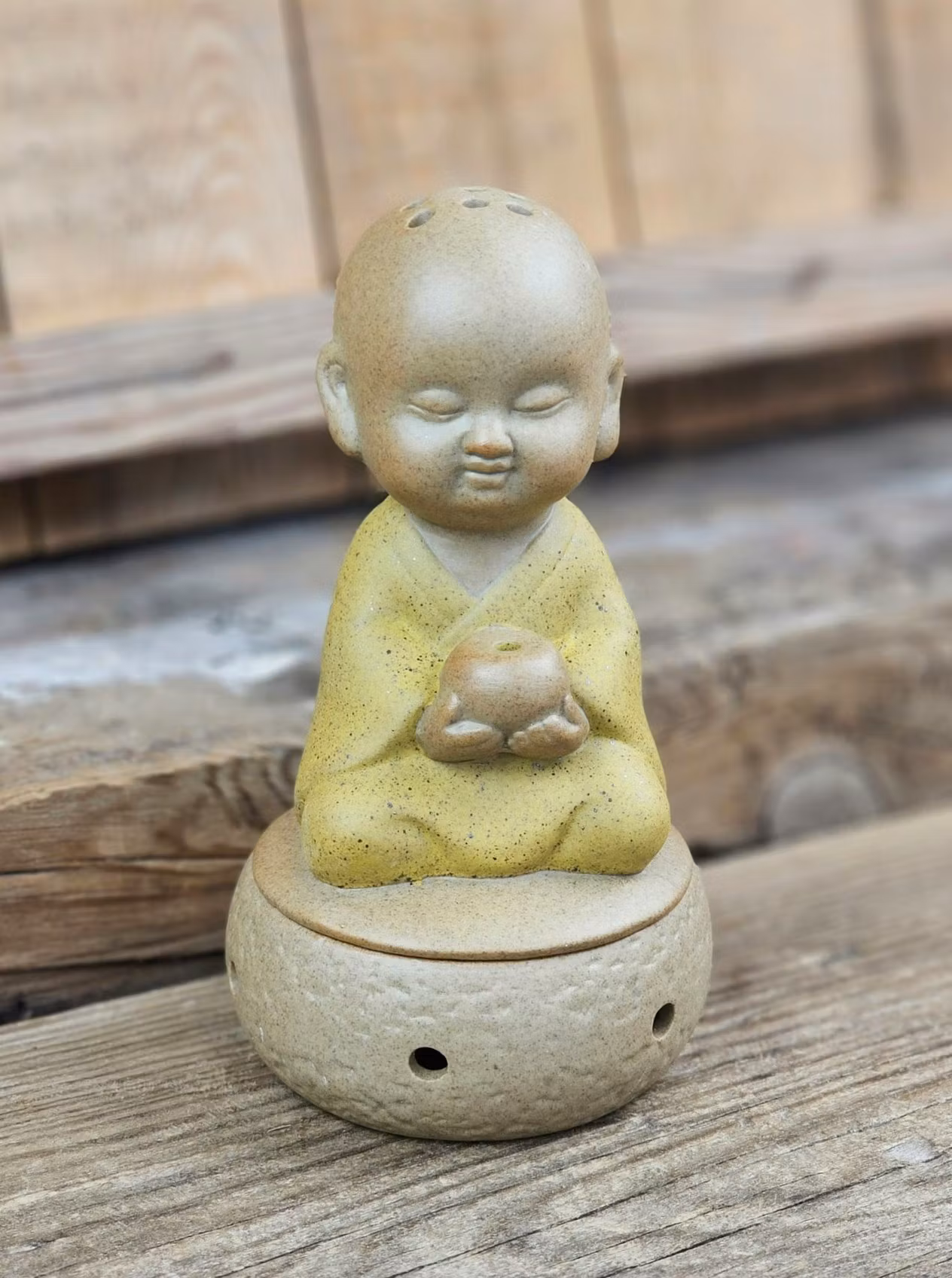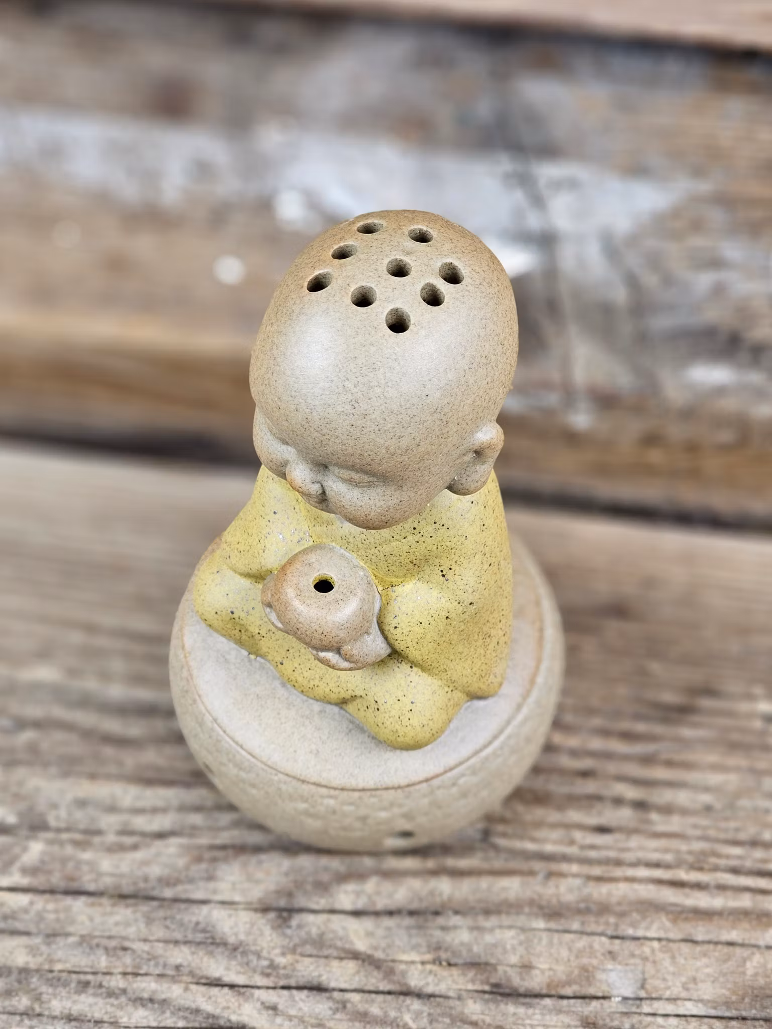 Mycket fin stor rökelsebrännare i keramik. Dessa hållare är anpassade för att bränna vanliga koner i (ej backflow) samt rökelsepinne som du kan placera i munkens famn. När du tänder din rökelsekon och sätter inne i denna fina hållare så sprider sig röken ut genom munkens huvud. Det ingår även en liten keramikhållare för att bränna rökelsepinnar. Säljes styckvis. Rökelser ingår ej, dessa köpes separat. Du köper slumpvis liknande rökelsehållare enligt text & bild ovan. Tänk på att små skillnader kan förekomma. Färger kan skilja sig beroende på hur ljuset faller ner på produkten samt även mellan olika bildskärmar m.m.