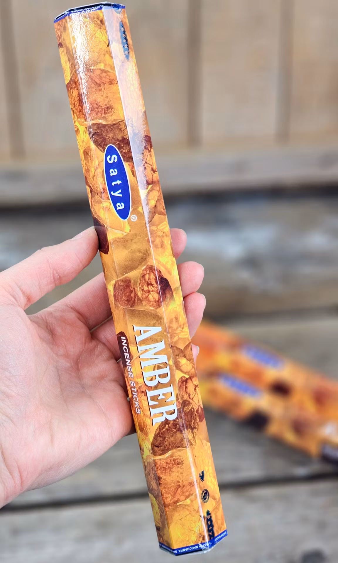 Doft: Amber. Varm, söt, kryddig, sensuell. Jordnära doften av Bärnsten med inslag av musk. Bärnstensrökelser används t.ex. för healing, meditation, känslomässig balansering och för att stärka passion. Med sin söta och kryddiga doft drar denna rökelse till sig självsäker energi.