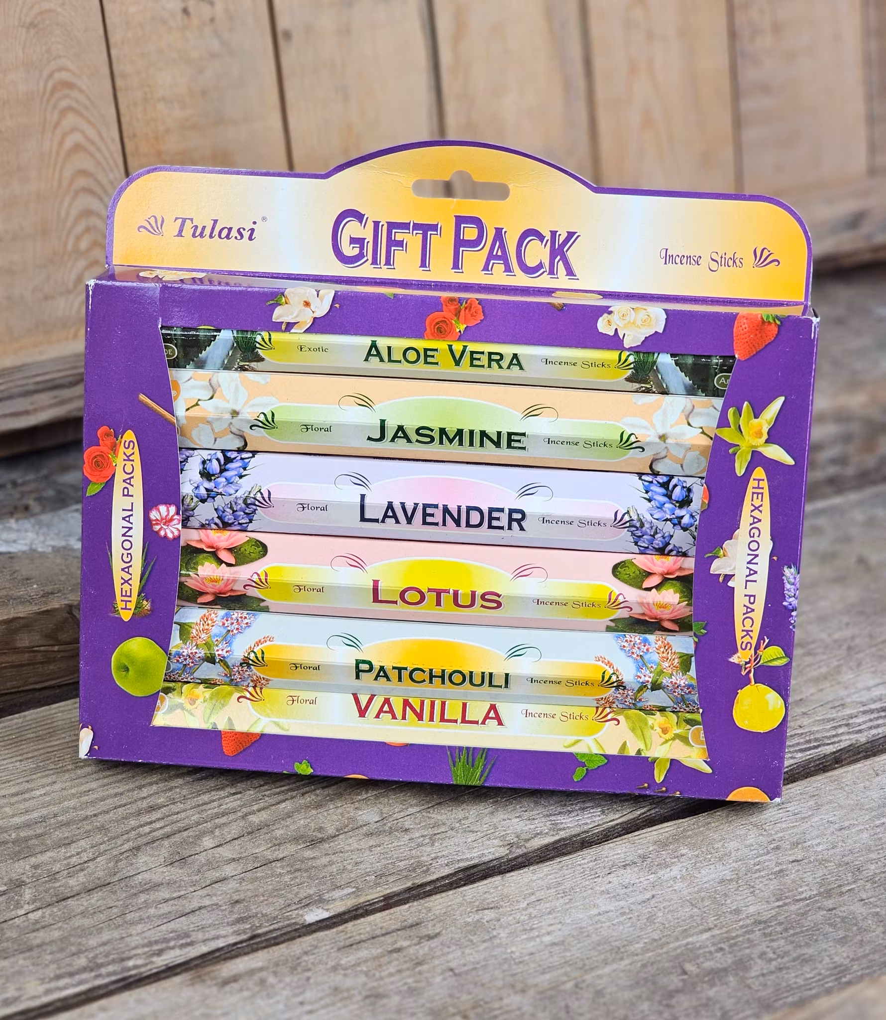 Säljes per 1 styck present-förpackning innehållande 6 stycken olika sorters rökelser från Tulasi. Varje rökelseförpackning innehåller ca 20 stycken rökelsepinnar. Observera att rökelsehållare ingår ej, dessa köpes separat.