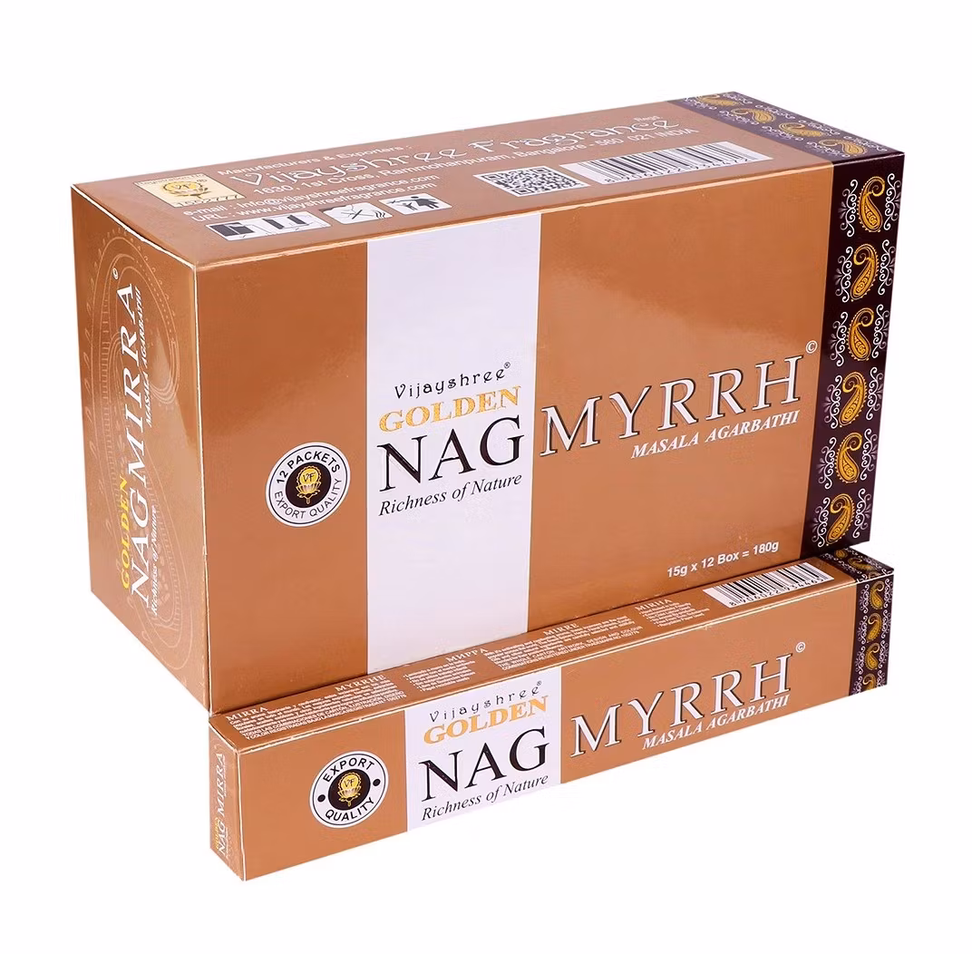 Doft: Golden Nag Myrrh. Fördjupa dig i en varm, balsamisk och mystisk doft med GOLDEN NAG Myrrh från Vijayshree. Tillverkad med högkvalitativt myrraharts, kommer denna rökelse att transportera dig till en miljö av djup avslappning, meditation och andlig anslutning.