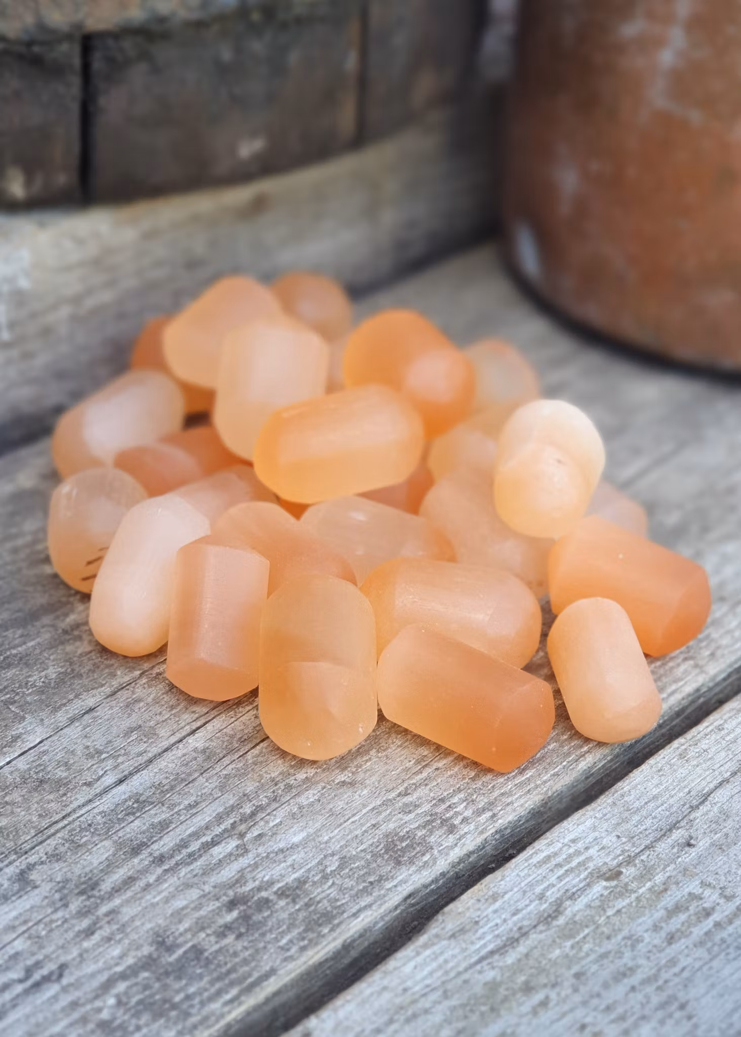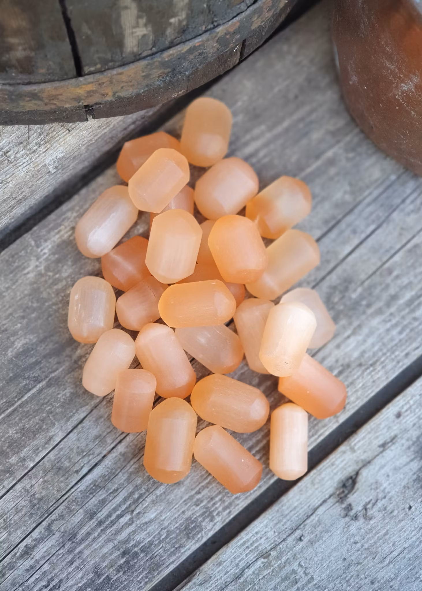 Mycket fin trumlad Orange Selenit. Säljes styckvis. De skiftar i utseende. Du köper en slumpvis liknande kristall enligt text & bild ovan. Tänk på att kristaller kommer från naturen & naturliga sprickor & ojämnhet kan förekomma. Färger kan skilja sig beroende på hur ljuset faller ner på kristallen samt även mellan olika bildskärmar m.m.
