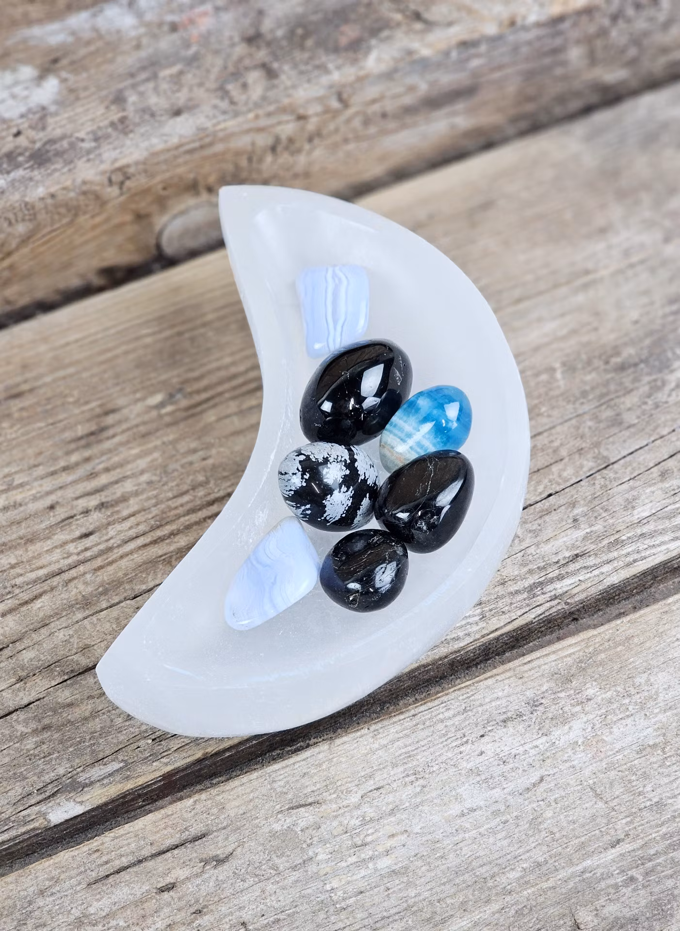 Vacker stor skål i Vit Selenit med formen av en måne. Jättefin förvaring till t.ex. dina trumlade stenar eller smycken! Observera att kristallerna i skålen inte ingår, dessa köpes separat i vår butik. Skålarna säljes styckvis. De skiftar i utseende. Du köper en slumpvis liknande skål enligt text & bild ovan. Tänk på att kristaller kommer från naturen & naturliga sprickor & ojämnhet kan förekomma. Färger kan skilja sig beroende på hur ljuset faller ner på kristallen samt även mellan olika bildskärmar m.m.