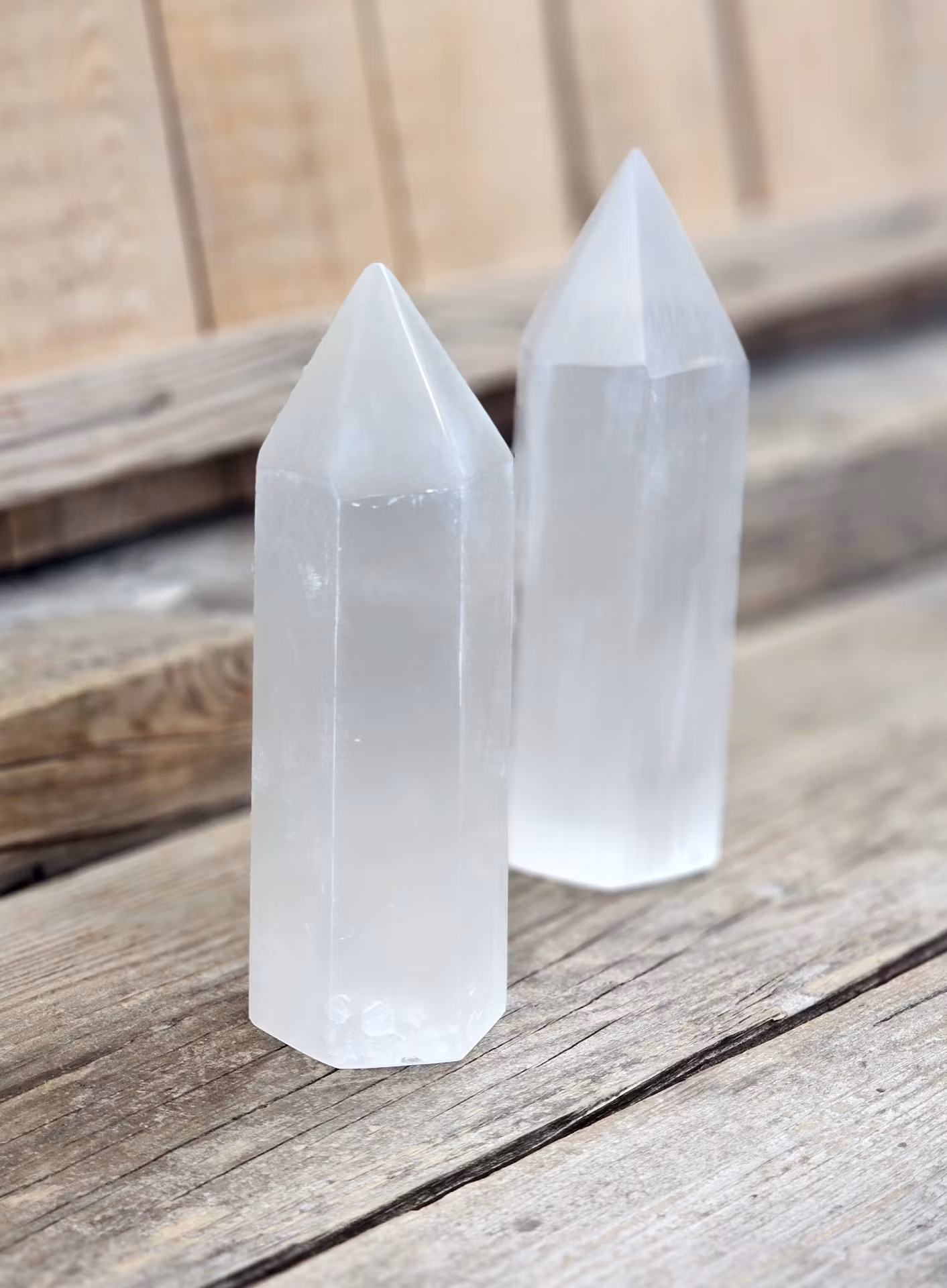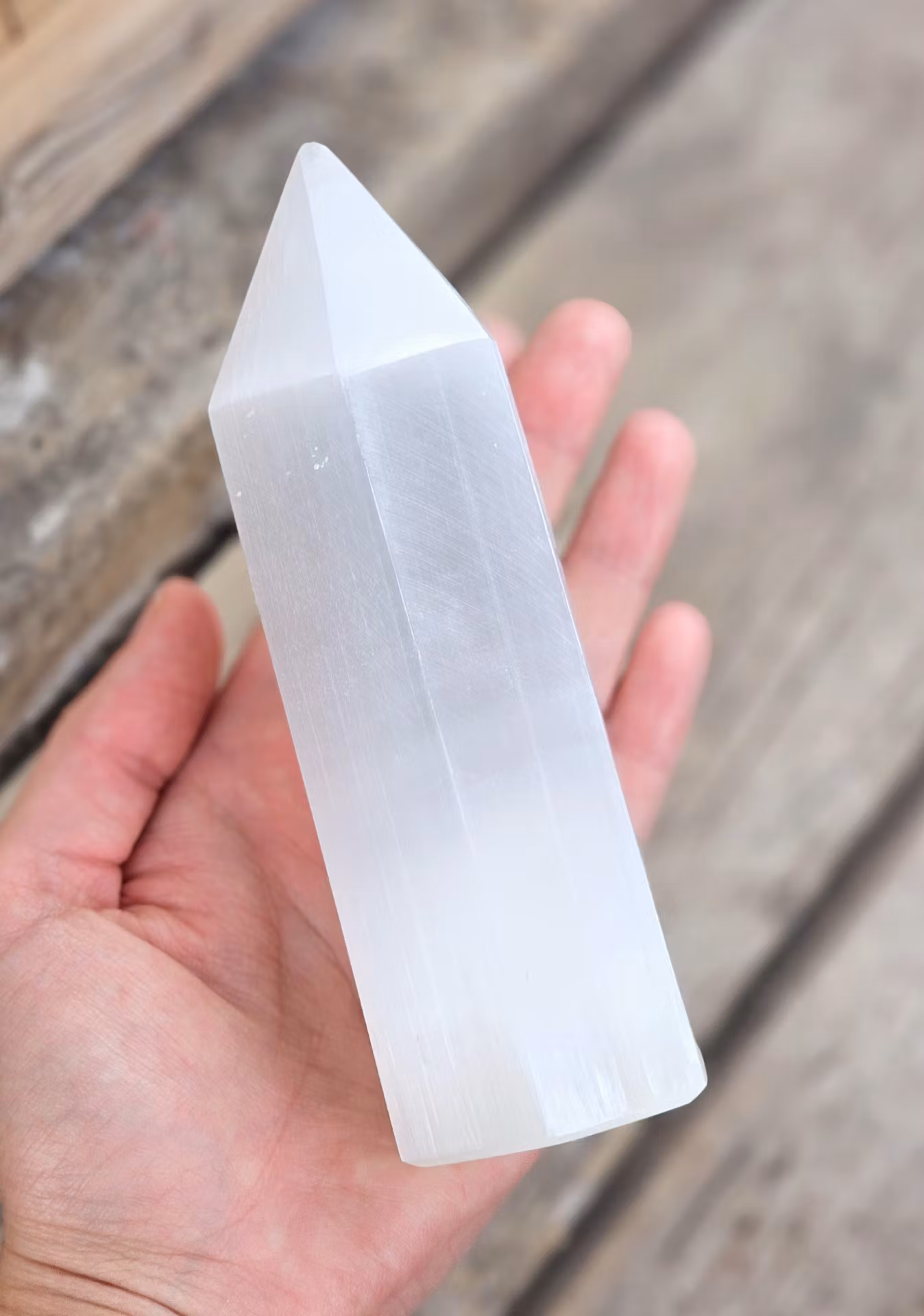 Helt fantastisk stor polerad spets i Vit Selenit. Dessa är med en otroligt vacker högglans! Säljes styckvis. De skiftar i utseende. Du köper en slumpvis liknande kristall enligt text & bild ovan. Tänk på att kristaller kommer från naturen & naturliga sprickor & ojämnhet kan förekomma. Färger kan skilja sig beroende på hur ljuset faller ner på kristallen samt även mellan olika bildskärmar m.m.