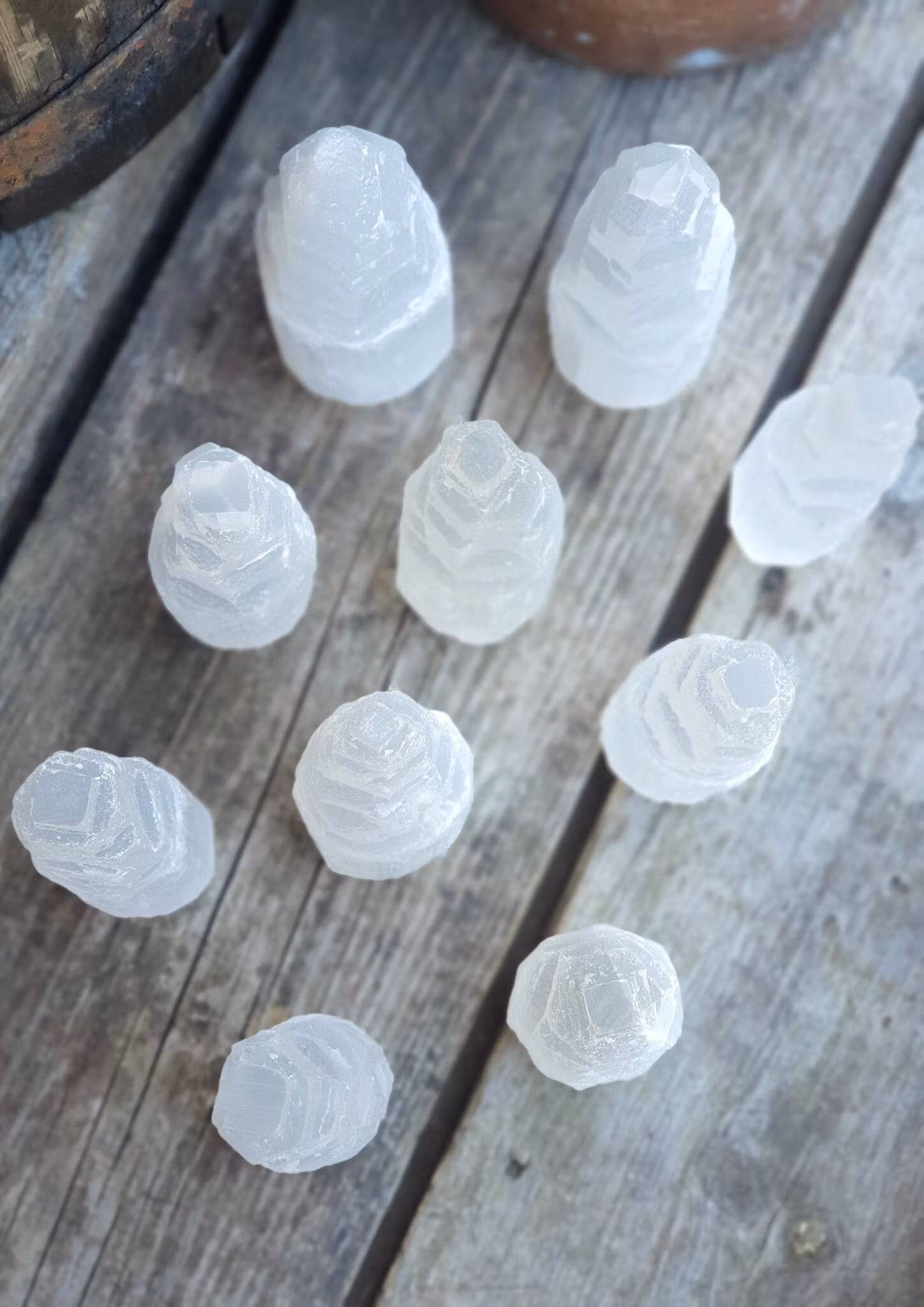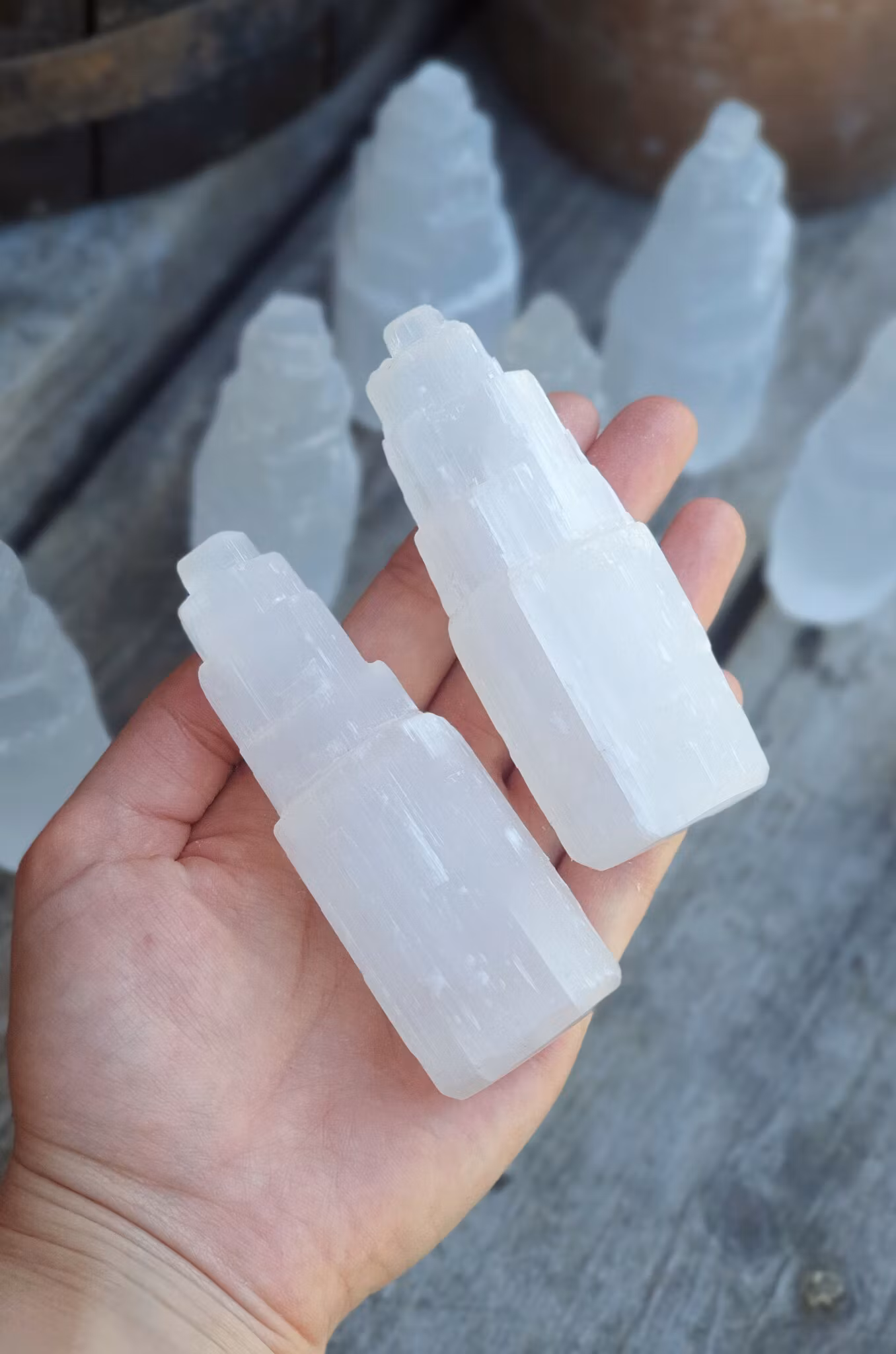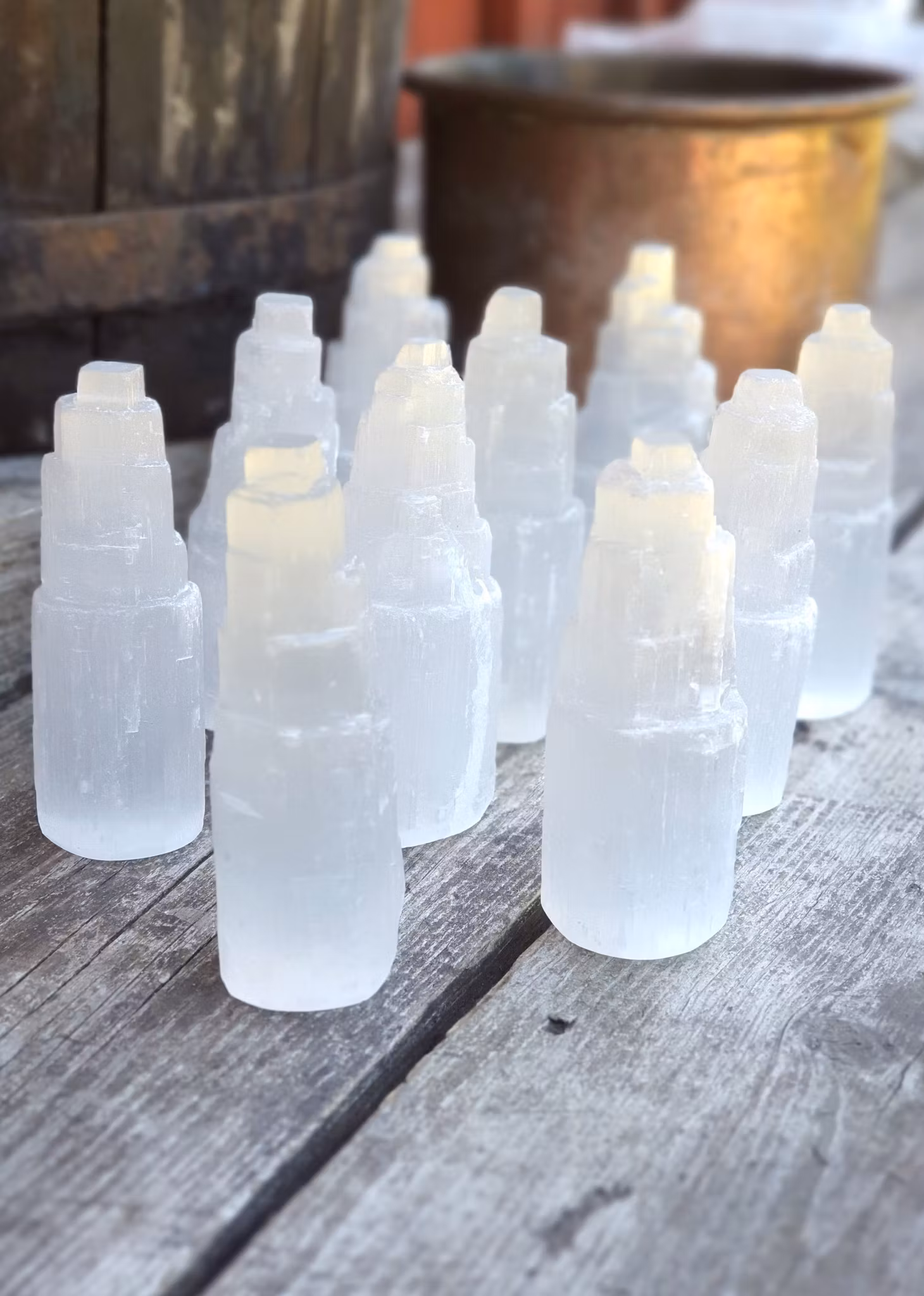 Mycket vackert torn i rå Vit Selenit med härlig lyster. Säljes styckvis. De skiftar i utseende. Du köper en slumpvis liknande kristall enligt text & bild ovan. Tänk på att kristaller kommer från naturen & naturliga sprickor & ojämnhet kan förekomma. Färger kan skilja sig beroende på hur ljuset faller ner på kristallen samt även mellan olika bildskärmar m.m.