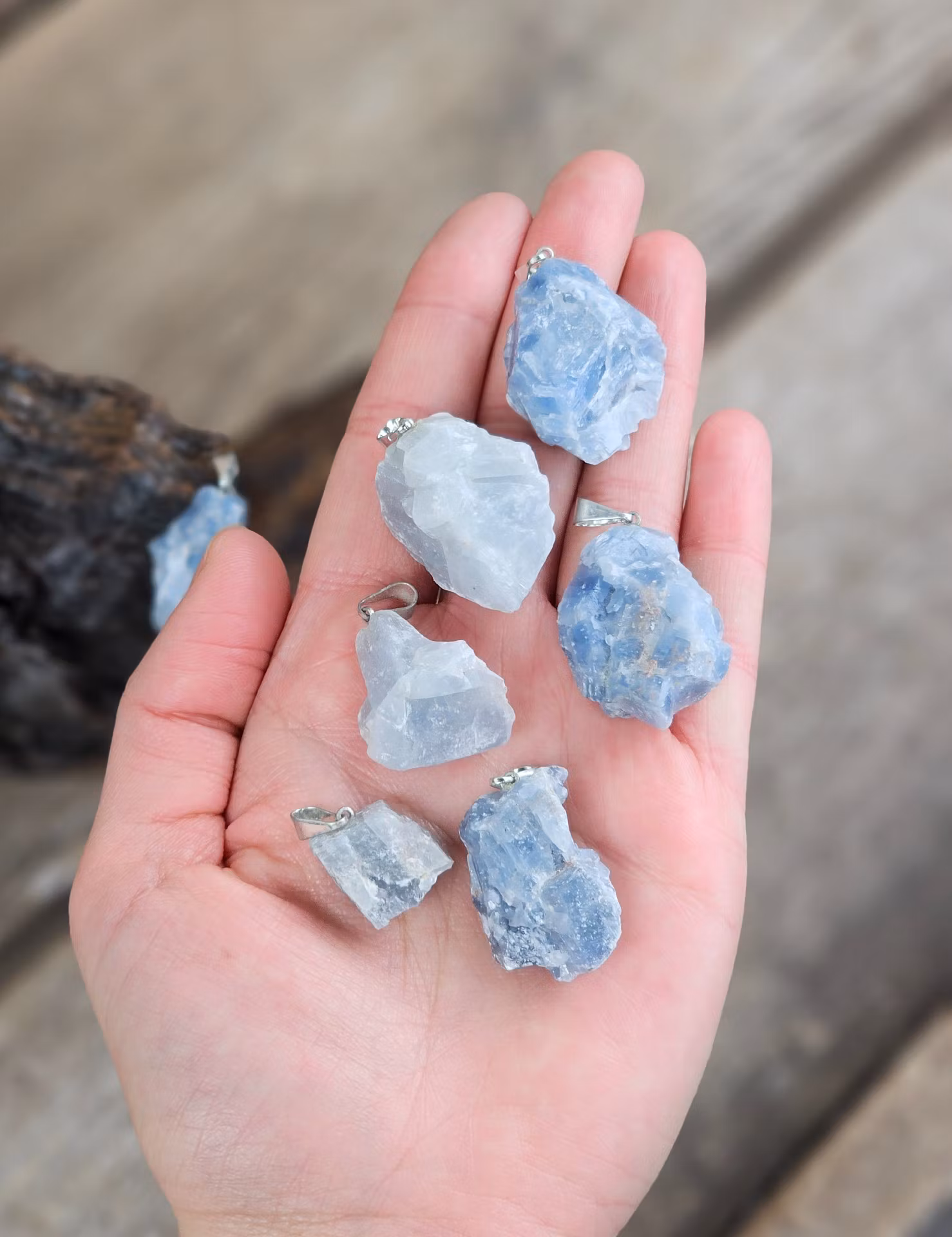 Underbara silverpläterade hängen med naturlig rå Blå Kalcit. De varierar i utseende. Säljes styckvis. Du köper slumpvis liknande smycke enligt text & bild ovan. Tänk på att kristaller kommer från naturen & naturliga sprickor & ojämnheter kan förekomma. Färger kan skilja sig beroende på hur ljuset faller ner på produkten samt även mellan olika bildskärmar m.m.