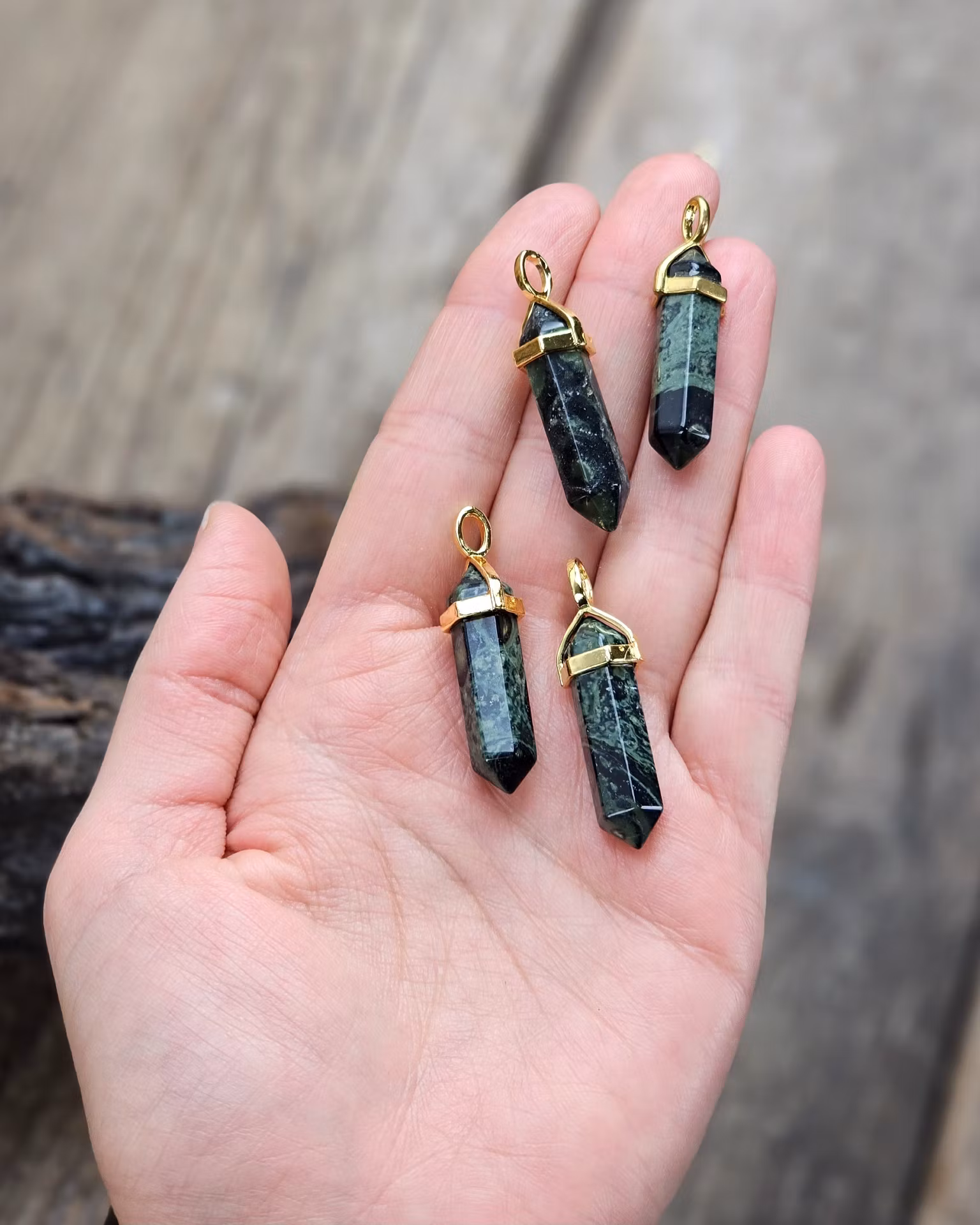 Underbart guldpläterat hänge med en vacker polerad spets i Kambabajaspis. De varierar i utseende. Säljes styckvis. Du köper ett slumpvis liknande smycke enligt text & bild ovan. Tänk på att kristaller kommer från naturen & naturliga sprickor & ojämnhet kan förekomma. Färger kan skilja sig beroende på hur ljuset faller ner på produkten samt även mellan olika bildskärmar m.m.