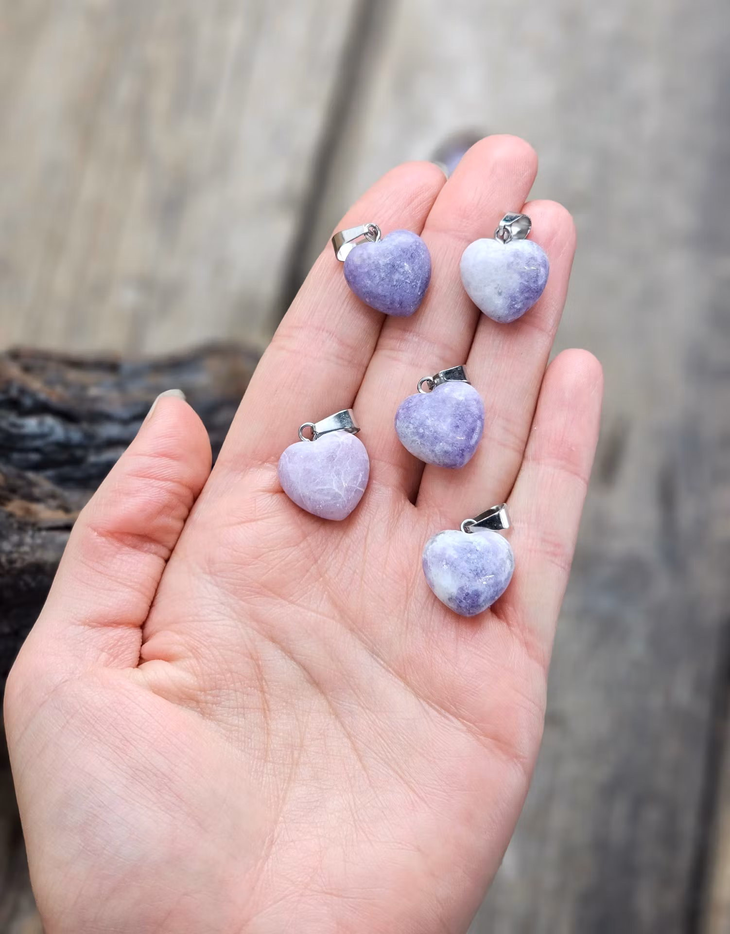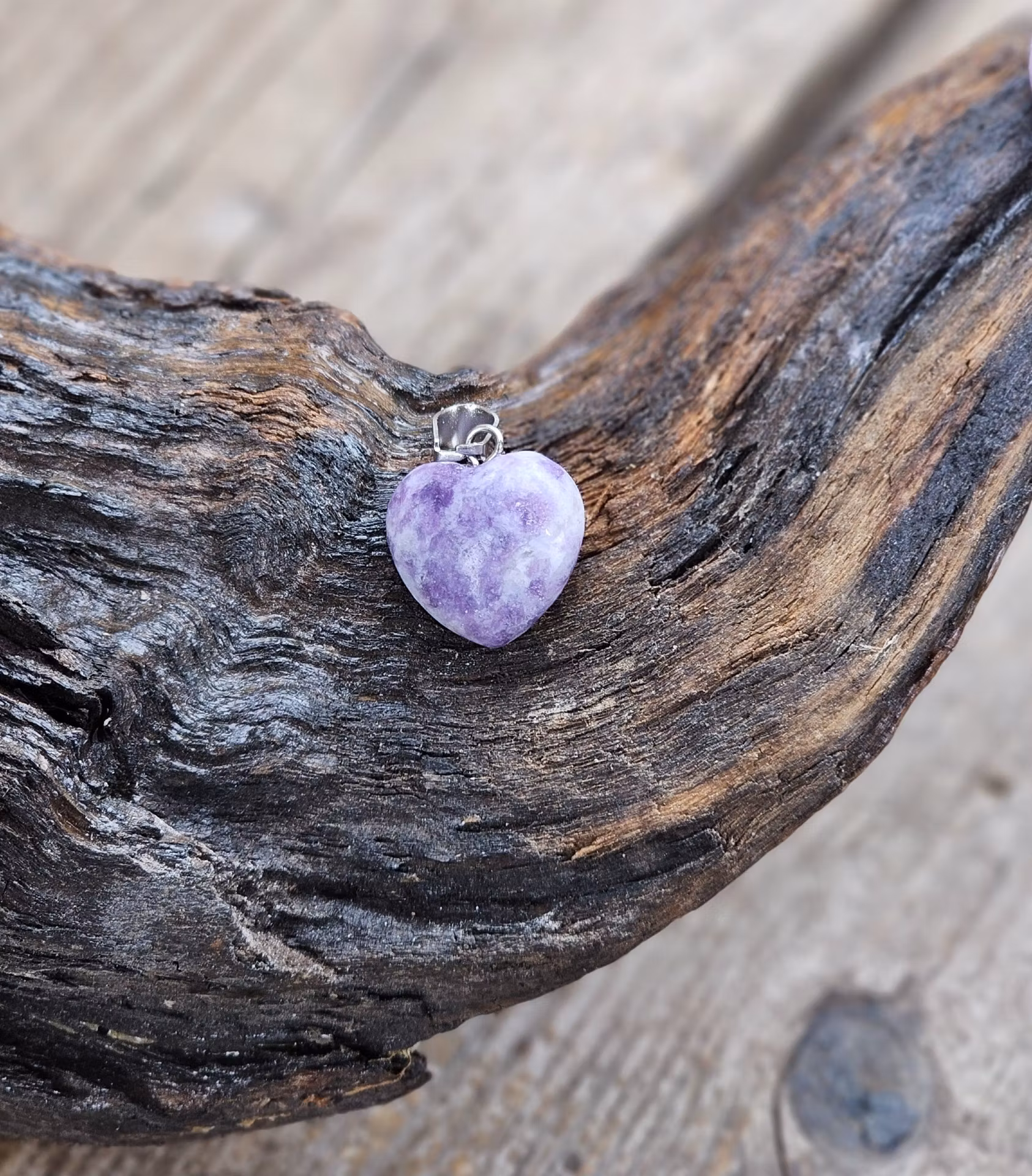 Vackert nätt silverpläterat hänge med ett fint hjärta i Lepidolit. De varierar i utseende. Säljes styckvis. Du köper ett slumpvis liknande smycke enligt text & bild ovan. Tänk på att kristaller kommer från naturen & naturliga sprickor & ojämnhet kan förekomma. Färger kan skilja sig beroende på hur ljuset faller ner på produkten samt även mellan olika bildskärmar m.m.