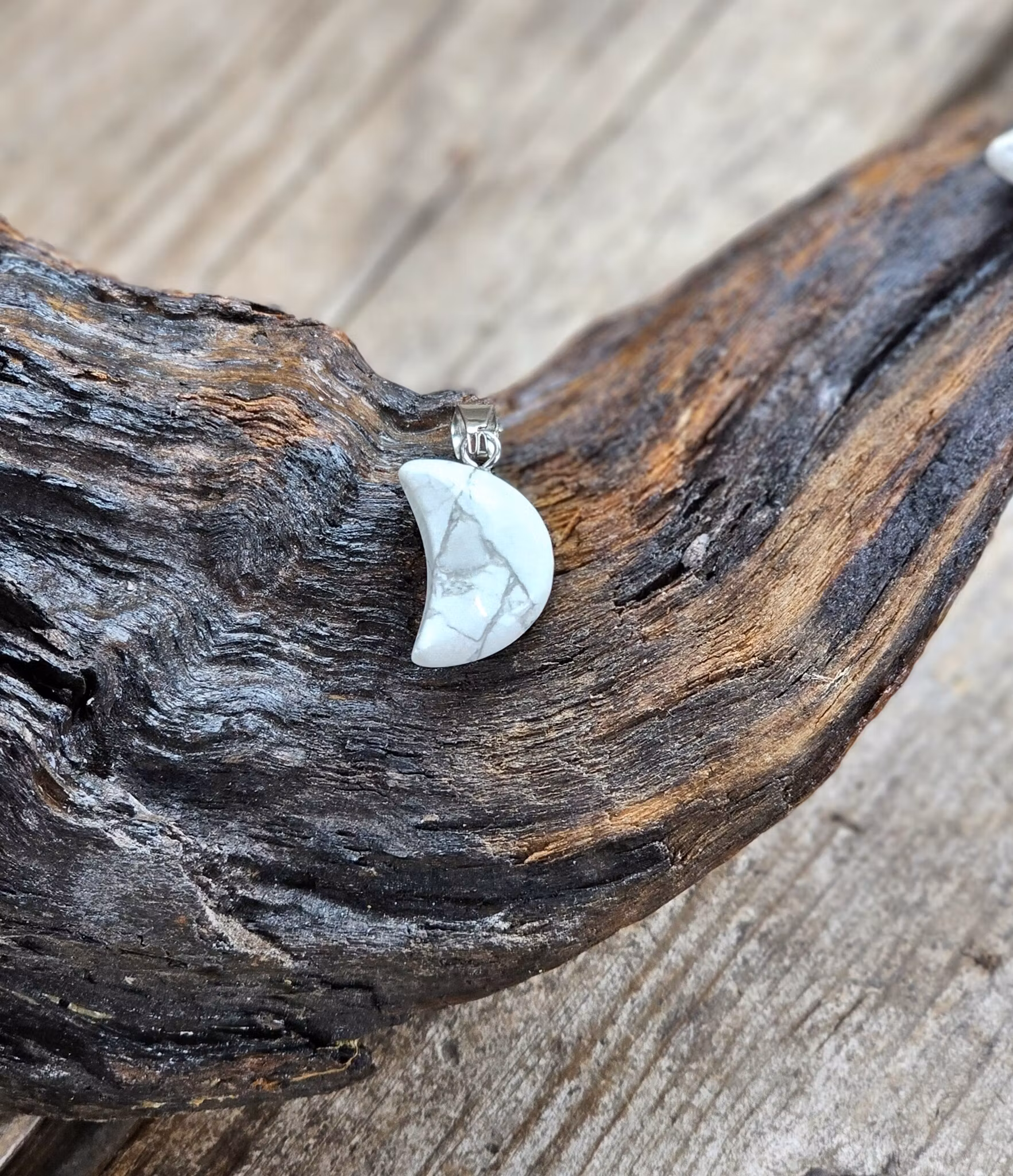 Fint silverpläterat hänge med en vacker liten nätt måne i Howlit. De varierar i utseende. Säljes styckvis. Du köper ett slumpvis liknande smycke enligt text & bild ovan. Tänk på att kristaller kommer från naturen & naturliga sprickor & ojämnheter kan förekomma. Färger kan skilja sig beroende på hur ljuset faller ner på produkten samt även mellan olika bildskärmar m.m.