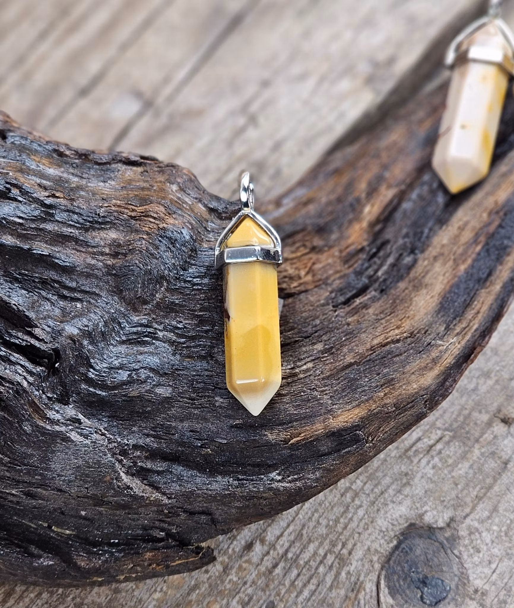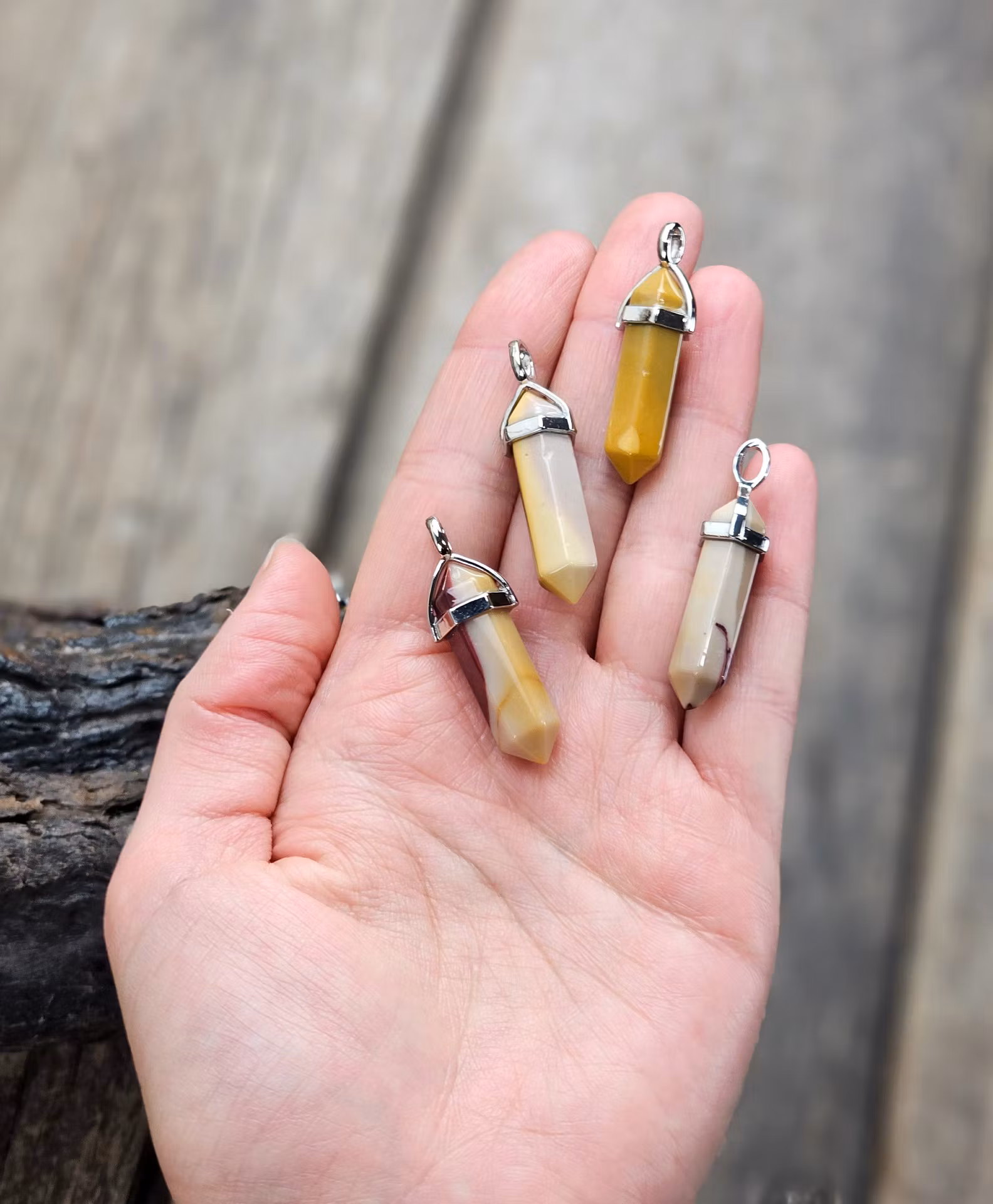 Underbart silverpläterat hänge med en vacker polerad spets i Mookaitjaspis. De varierar i utseende. Säljes styckvis. Du köper ett slumpvis liknande smycke enligt text & bild ovan. Tänk på att kristaller kommer från naturen & naturliga sprickor & ojämnhet kan förekomma. Färger kan skilja sig beroende på hur ljuset faller ner på produkten samt även mellan olika bildskärmar m.m.