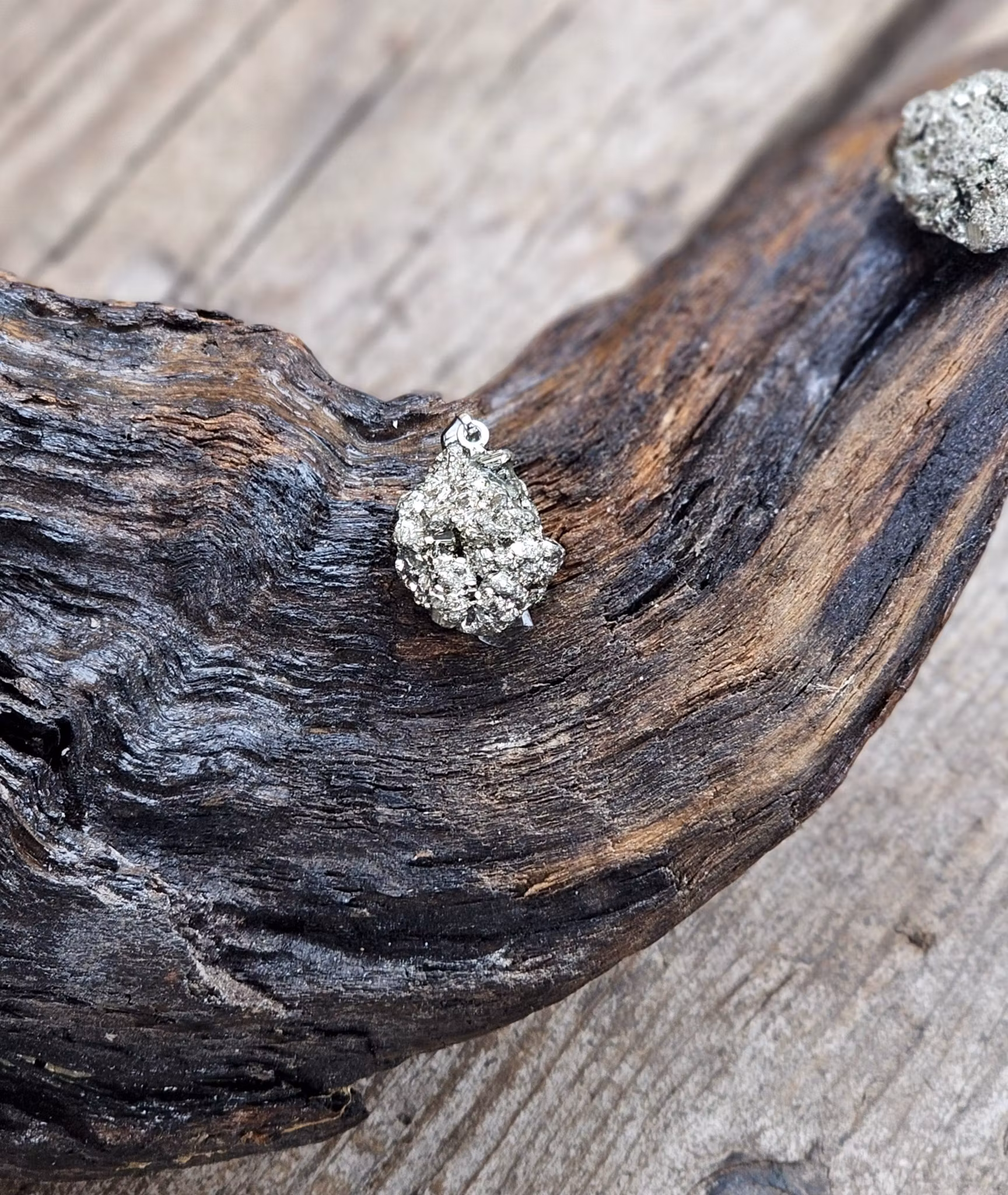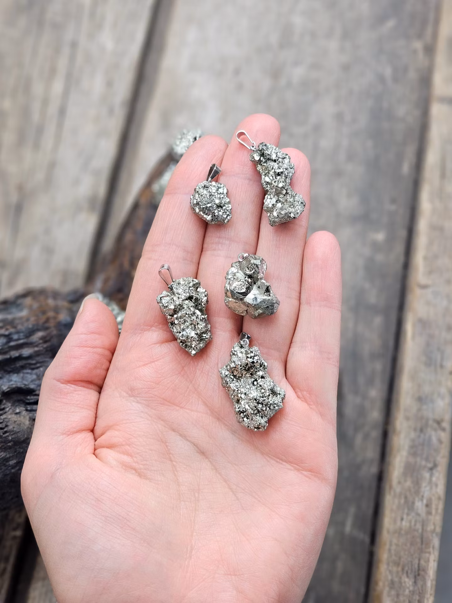 Vackert silverpläterat hänge med naturlig rå Pyritkluster. De varierar i utseende. Säljes styckvis. Du köper slumpvis liknande smycke enligt text & bild ovan. Tänk på att kristaller kommer från naturen & naturliga sprickor & ojämnheter kan förekomma. Färger kan skilja sig beroende på hur ljuset faller ner på produkten samt även mellan olika bildskärmar m.m.