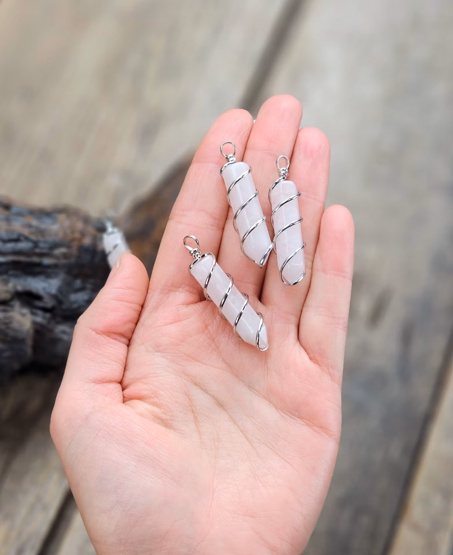 Mycket vackert silverpläterat hänge med en polerad spets i Rosenkvarts med vacker snurrad silvertråd runt. De varierar i utseende. Säljes styckvis. Du köper slumpvis liknande smycke enligt text & bild ovan. Tänk på att kristaller kommer från naturen & naturliga sprickor & ojämnheter kan förekomma. Färger kan skilja sig beroende på hur ljuset faller ner på produkten samt även mellan olika bildskärmar m.m.