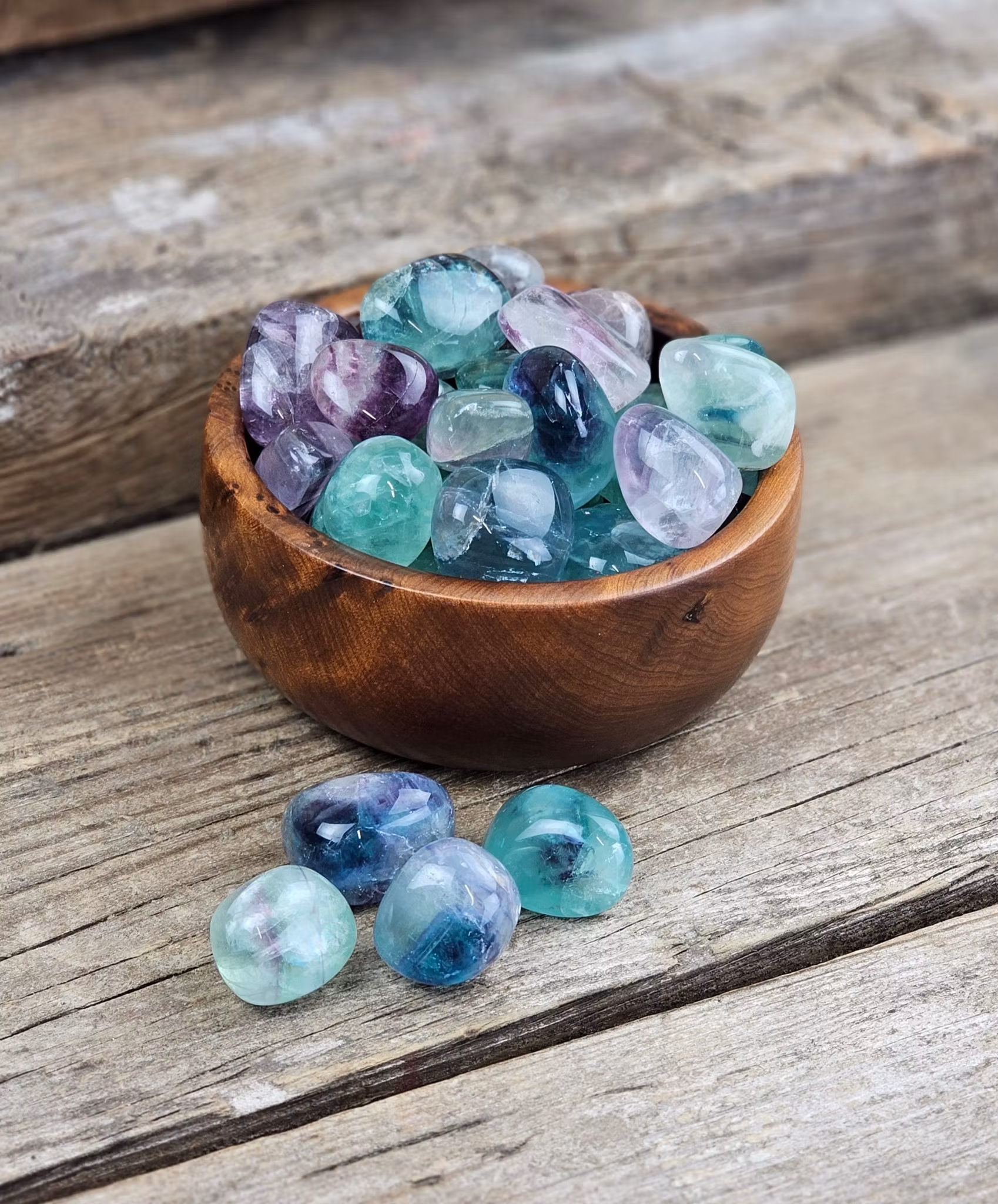 Helt fantastisk trumlad Regnbågsfluorit med jättefina färger. Superfin kvalité. Säljes styckvis. De skiftar i utseende & form. Du köper en slumpvis liknande kristall enligt text & bild ovan. Tänk på att kristaller kommer från naturen & naturliga sprickor & ojämnheter kan förekomma. Färger kan skilja sig beroende på hur ljuset faller ner på kristallen samt även mellan olika bildskärmar m.m.